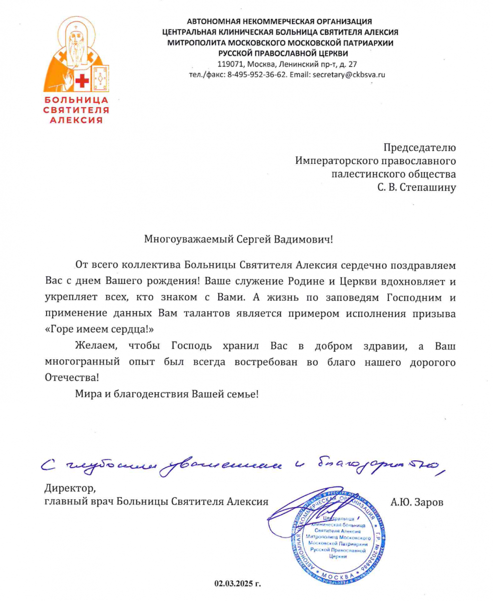 В адрес Председателя старейшей в России международной общественной организации, председателя Благотворительного фонда «Христианское милосердие» Сергея Степашина поступило поздравительное письмо по случаю дня рождения от имени директора и главного врача Больницы Святителя Алексия Алекся Зарова.