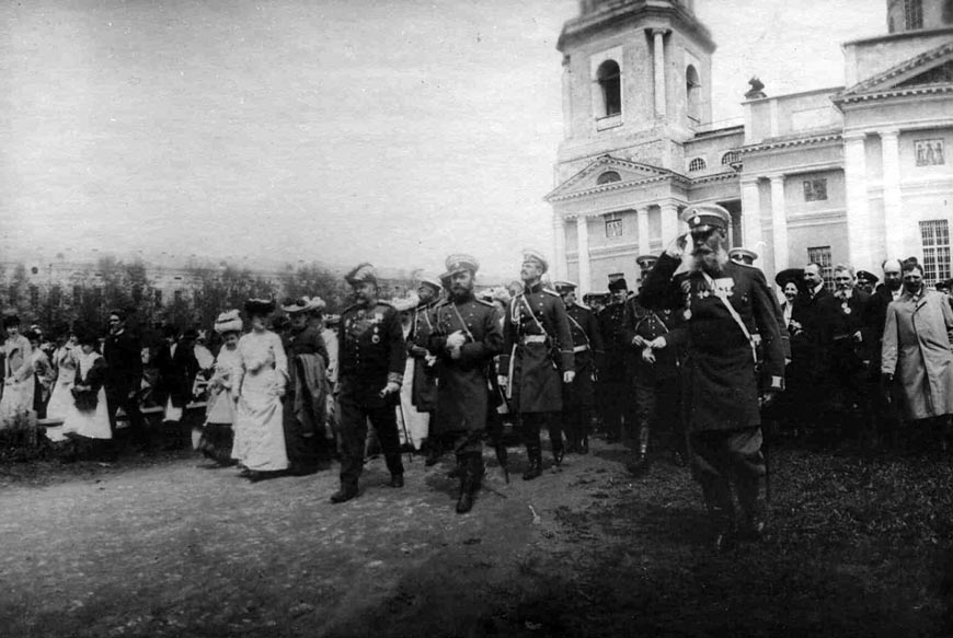 Государь Император Николай II, Великий князь Сергей Александрович и Великий Князь Михаил Александрович выходят после Божественной литургии из Свято-Троицкого кафедрального собора Калуги. Фотоснимок от 20 мая 1904 года.