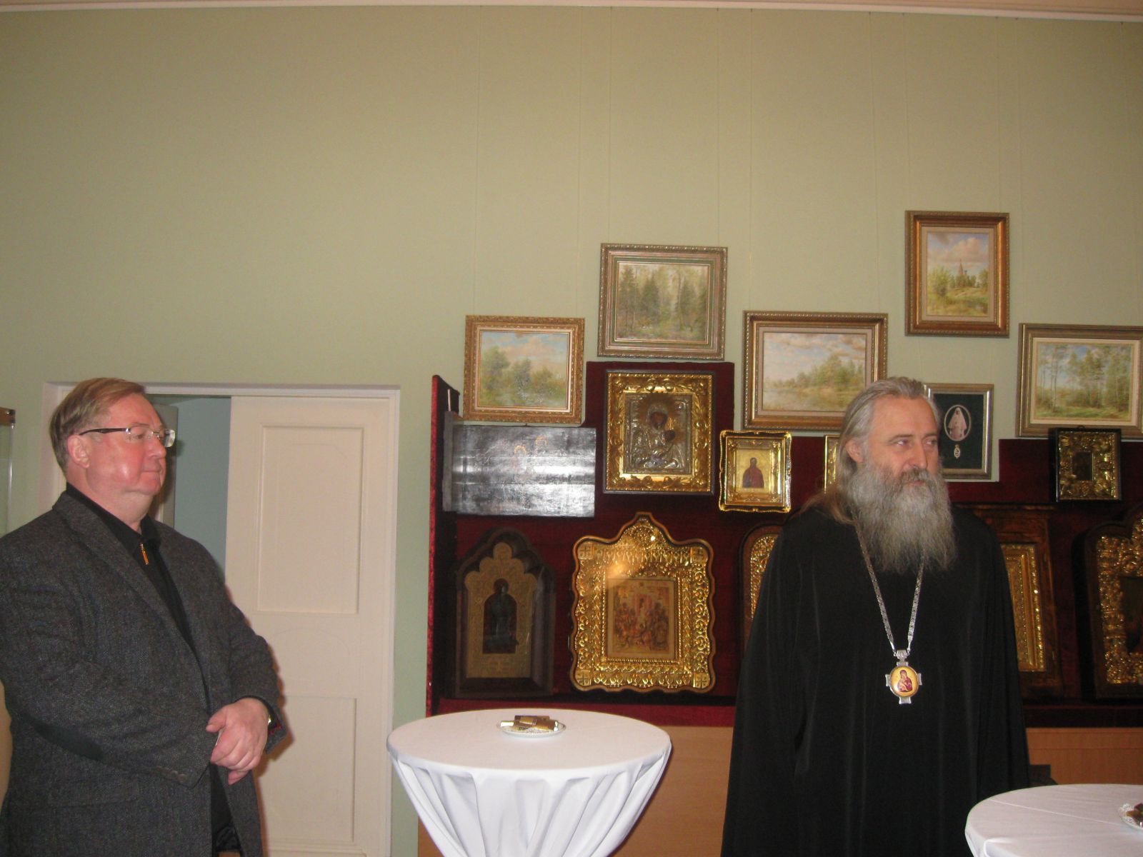 Председатель ИППО ознакомилархиепископа Сергиево - Посадского с выставкой икон, выставленных в настоящее время в Центре ИППО. Уникальная коллекция предоставлена реставрационно-иконописной мастерской «Валаам». По благословению игумена Валаамского монастыря архимандрита Панкратия эта мастерская выделилась в самостоятельное предприятие из московского подворья Спасо-Преображенского Валаамского монастыря.
