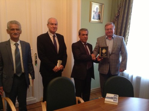По окончании беседы, которая касалась широкого круга гуманитарных вопросов, Председатель ИППО вручил Послу Государства Палестина почетный знак ИППО и книгу доктора исторических наук, профессора, историка Общества Н.Н.Лисового «Святая Земля: история и наследие".