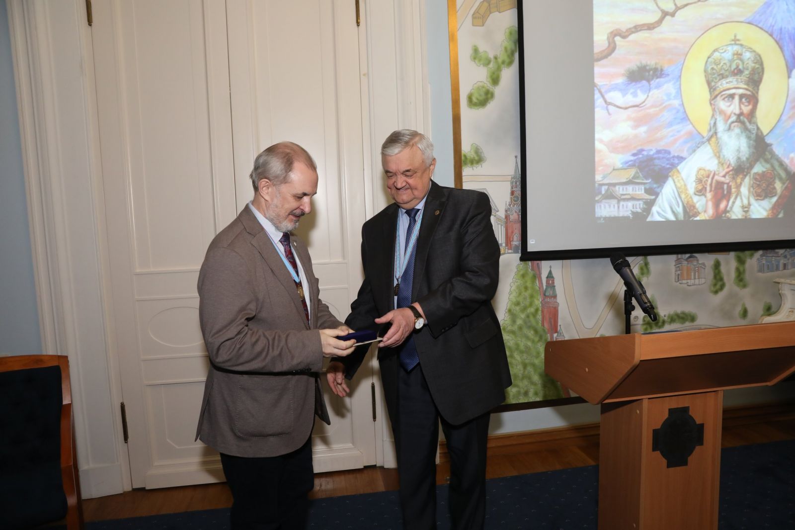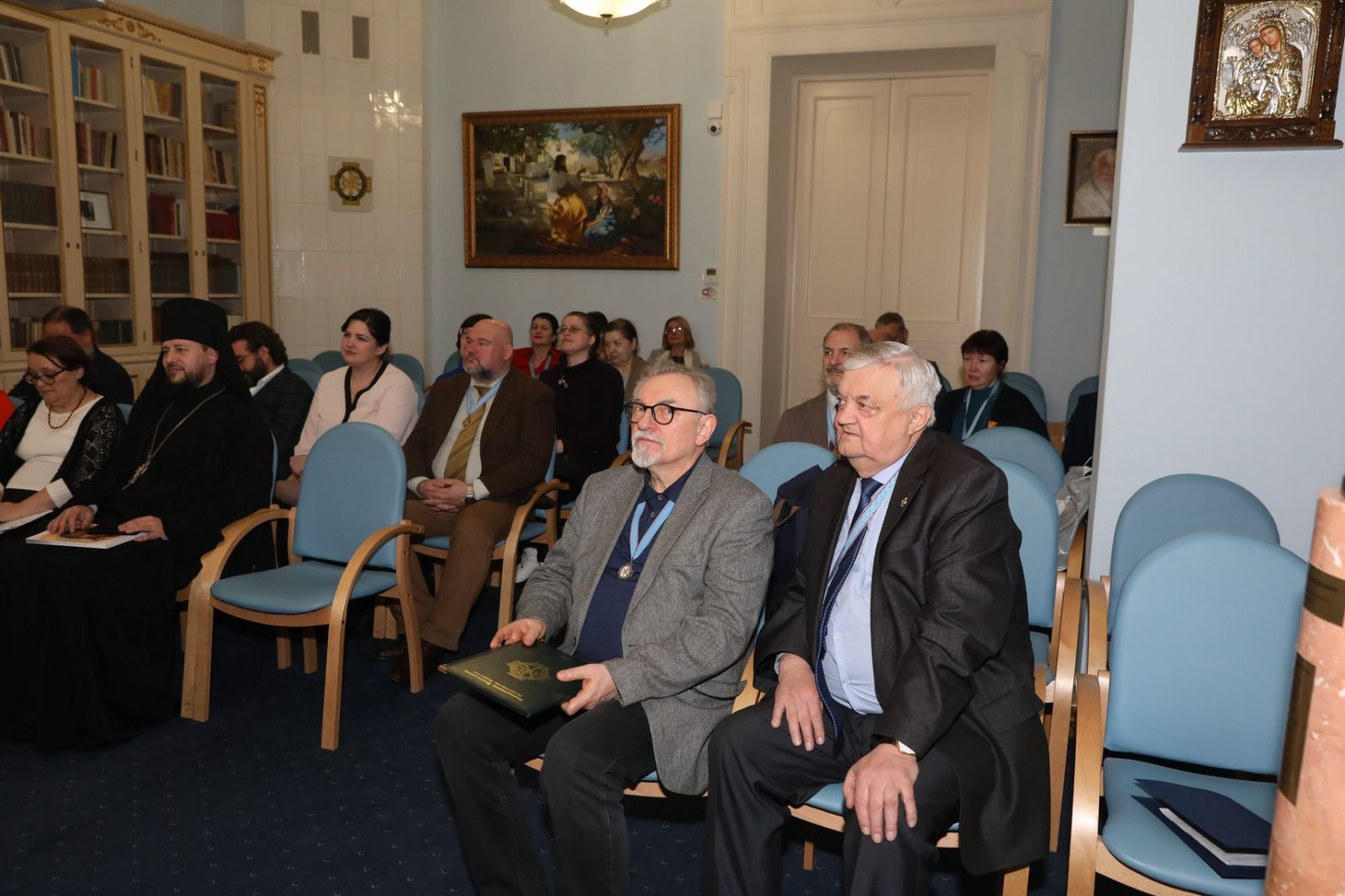 Затем состоялась торжественная церемония награждения. Георгий Веренич вручил Почётный знак ИППО памяти А.А. Дмитриевского члену Научной секции Общества Юрию Савельеву. Игумен Иоанн, заместитель Председателя Синодального отдела религиозного образования и катехизации, вручил членам научно-редакционного совета проекта «Собрание трудов святителя равноапостольного Николая Японского» патриаршие награды - юбилейные медали Русской Православной Церкви «50 ЛЕТ АВТОНОМИИ ЯПОНСКОЙ ПРАВОСЛАВНОЙ ЦЕРКВИ.1970-2020» Ирине Смирновой, Ирине Кузьминой и Галине Бесстремянной.