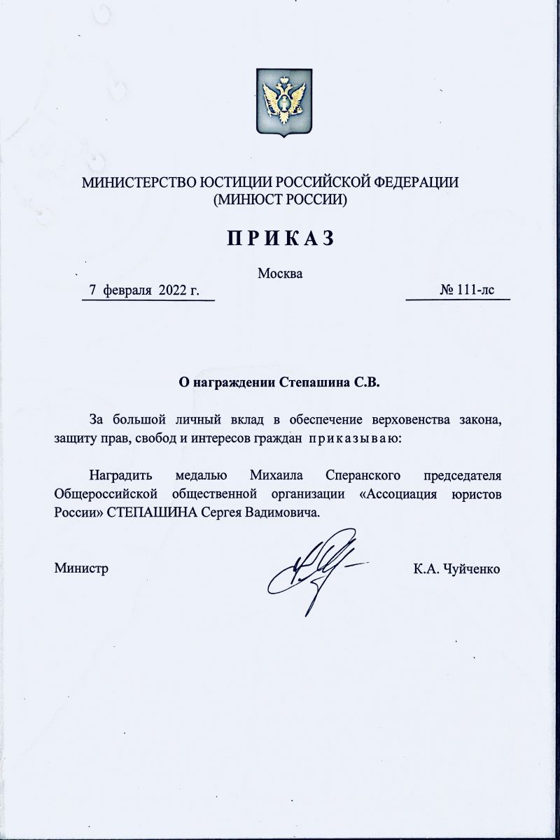 Константин Чуйченко поздравил Сергея Степашина с 70-летием и вручил ведомственную награду Минюста России - медаль Михаила Сперанского. Награда присвоена с формулировкой «За большой личный вклад в обеспечение верховенства закона, защиту прав, свобод и интересов граждан».