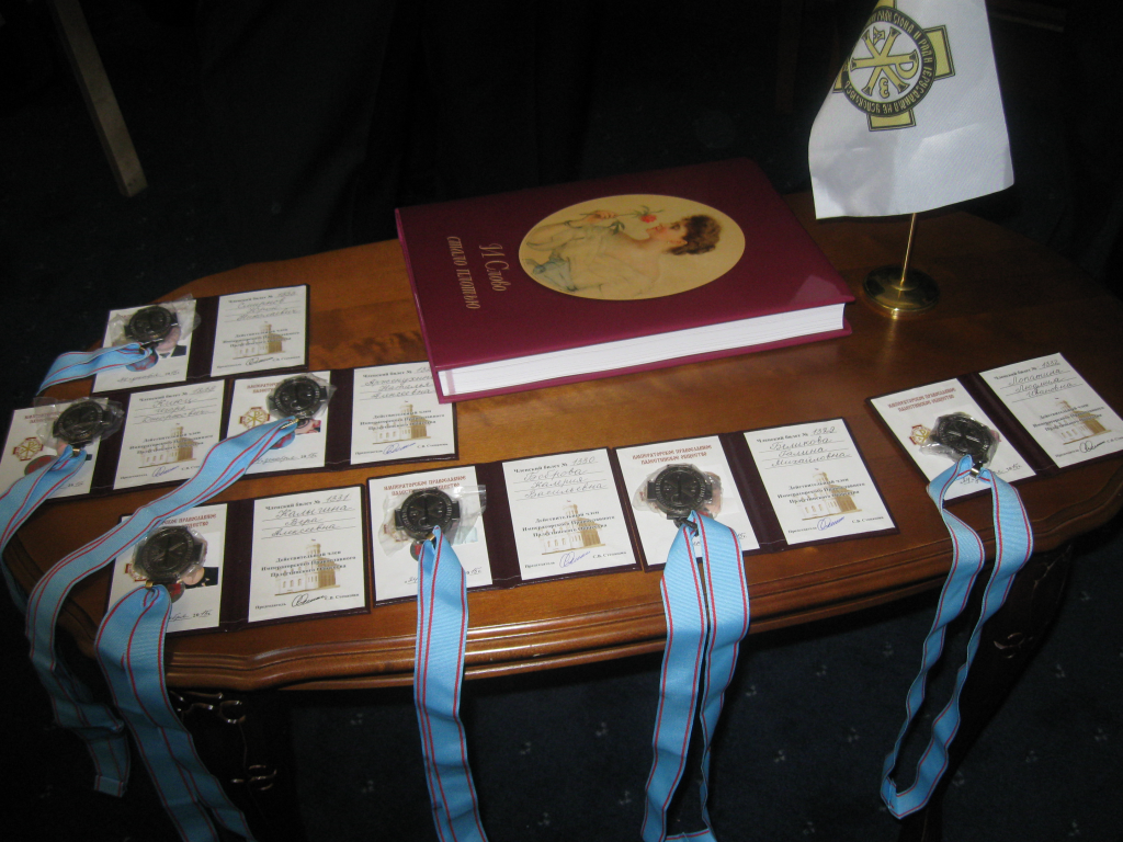 Затем были вручены удостоверения и знаки ИППО вновь вступившим членам Общества, а также высокие награды ИППО, которыми были удостоены члены отделения: С.В. Забурниягин – Орден Великого князя Сергия Александровича, В.Н. Клементьев – Медаль имени В.Н. Хитрово, протоиерей Борис Токарев – Медаль имени архимандрита Антонина (Капустина), Р.Б. Бутова – Медаль имени А.А. Дмитриевского, О.Ю. Токарева – Грамота ИППО.