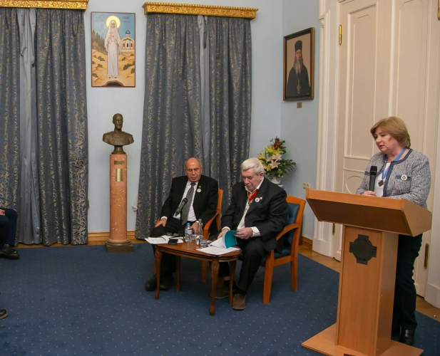 Почетный член Общества Юрий Смирнов рассказал о том, что за 10 лет с момента основания Московского областного отделения Общества отделения сложились прекрасные отношения с другими региональными отделениями и зарубежными представительствами ИППО. Активная позиция членов отделения, их социальная, паломническая и просветительская деятельность, военно-патриотическое воспитание молодежи, успехи в реставрации, строительстве и благоукрашении храмов, расширении религиозных контактов хорошо известны всем членам Общества. От имени Совета Московского областного отделения ИППО Юрий Петрович искренне поблагодарил все региональные отделения и представительства за поддержку и совместную работу во благо ИППО в вопросах укрепление его общественного положения, распространение знаний о Святой Земле, наследии и современной деятельности Общества.