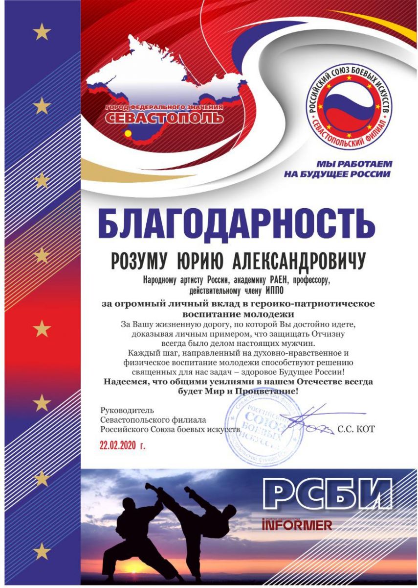 По представлению руководителя Московского областного отделения ИППО, Почетного члена Общества Юрия Смирнова, от имени Российского союза боевых искусств Сергей Кот вручил благодарственную грамоту Юрию Розуму.