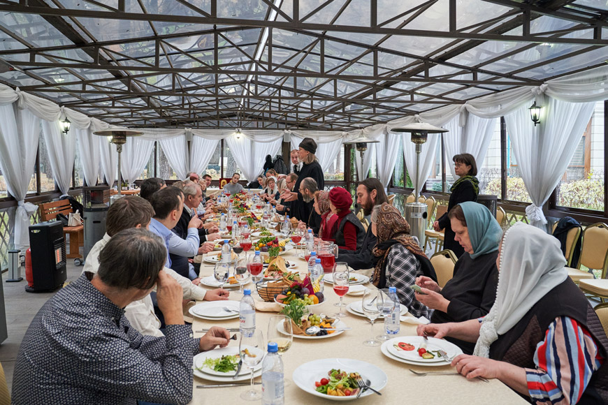 После Причастия староста храма Евгения Лебединская угостила ребятишек сладостями, а взрослые прихожане вместе с пастырями отправились на веранду, во внутренний двор Обители Святой Елисаветы. Там всё было подготовлено для трапезы и чаепития – ещё одна традиция, установленная настоятелем храма митрополитом Марком и ктитором храма Игорем Ашурбейли.