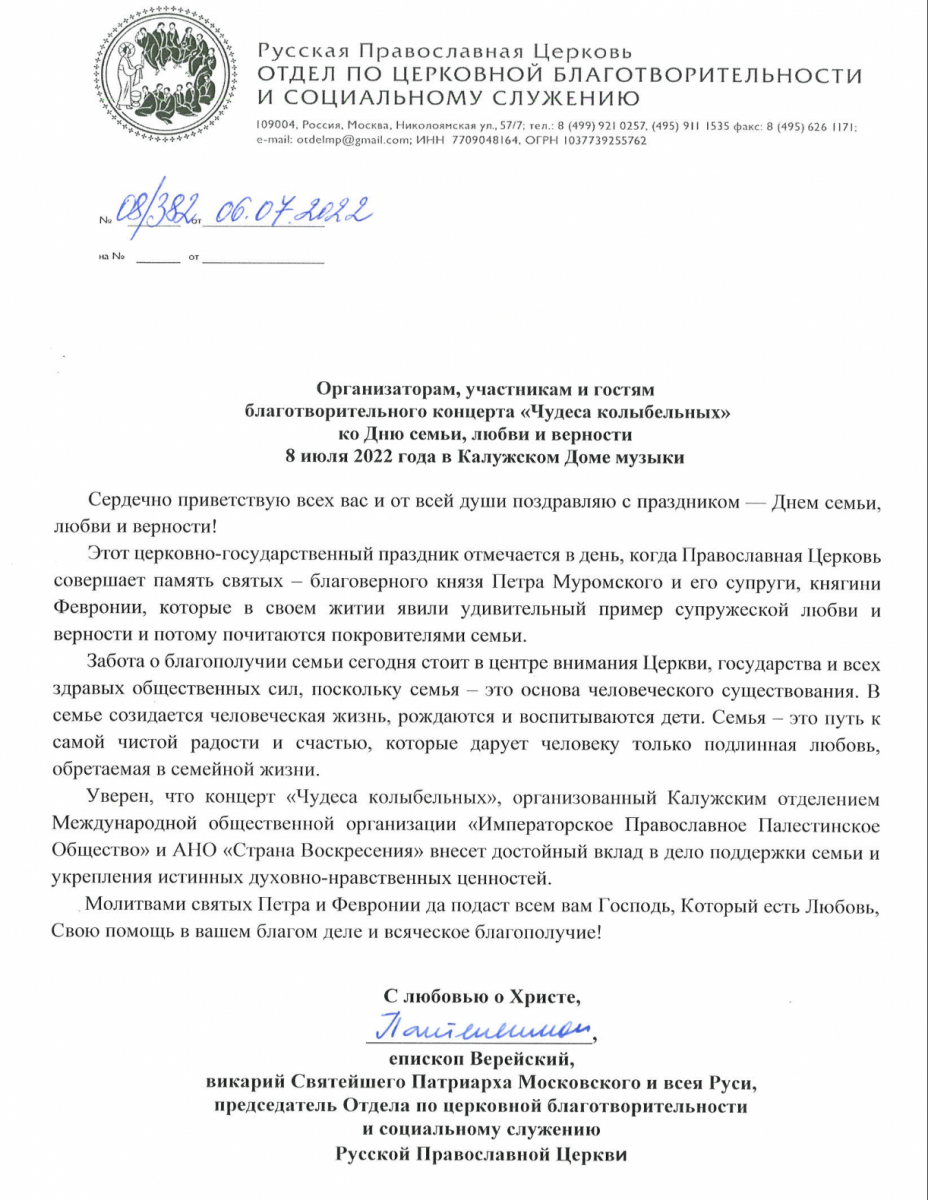 В своем обращении епископ Верейский Пантелеимон отметил: «Забота о благополучии семьи сегодня стоит в центре внимания Церкви, государства и всех здравых общественных сил, поскольку семья – основа человеческого существования. Уверен, что концерт «Чудеса колыбельных» внесет достойный вклад в дело поддержки семьи и укрепления истинных духовно-нравственных ценностей».