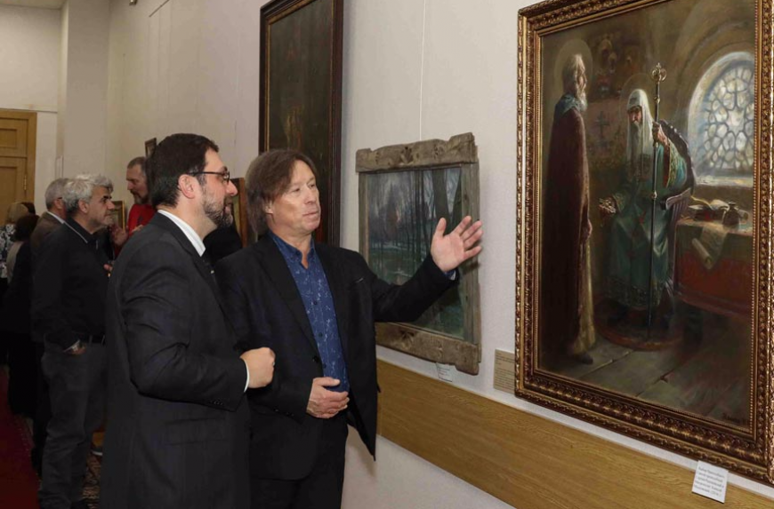 На выставке представлено несколько десятков работ художника, посвящённых православной и исторической тематике, например, изображены московские храмы, представлен портрет Патриарха Алексия II (Ридигера; † 2008 г.).