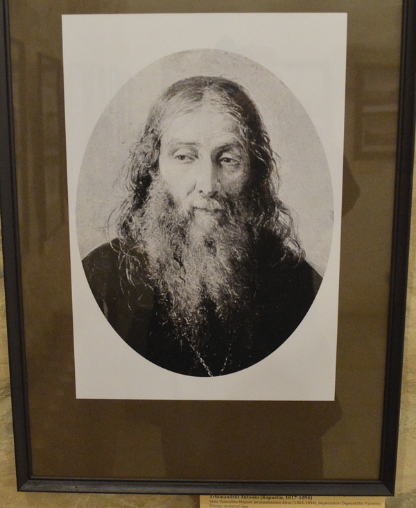Несомненно, одно из центральных мест в экспозиции занимает портрет архимандрита Антонина (Капустина), руководителя Русской духовной миссии в Иерусалиме в 1865-1894 годах. Его имя входит в золотой фонд истории Русской Церкви. Подвигом жизни отца Антонина стало создание Русской Палестины - целой инфраструктуры храмов, монастырей, паломнических приютов и земельных участков, связанных преданием с важнейшими новозаветными и ветхозаветными событиями.