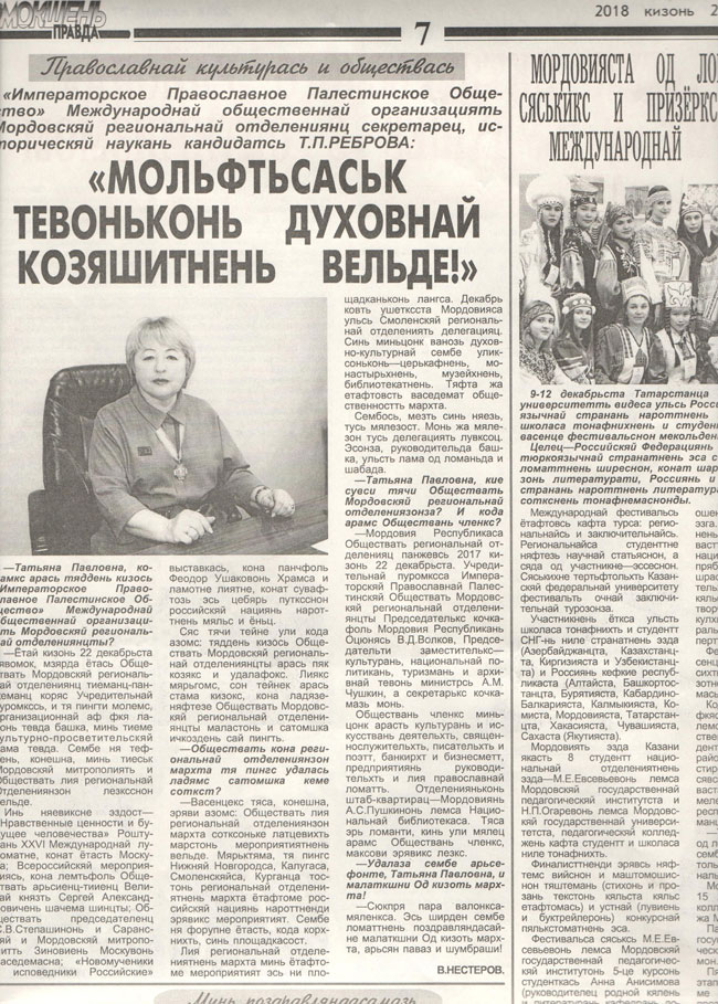 В выпуске газеты «Мокшень Правда» за 27 декабря опубликованы поздравления с наступающими праздниками от действительных членов Мордовского отделения Императорского Православного Палестинского Общества.