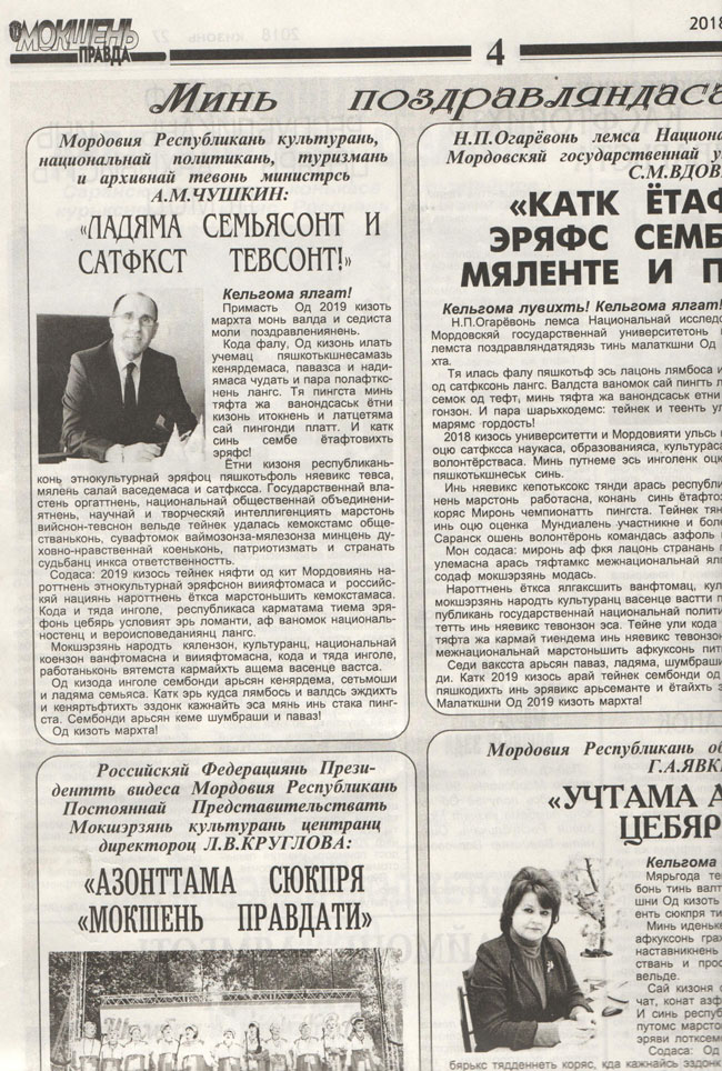 В газете «Мокшень Правда» члены Мордовского отделения ИППО поздравили мордовцев с наступающими праздниками