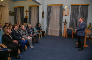 Участники мероприятия смогли ознакомиться с выставкой «Непобедимый адмирал – непобедимая Россия: святой праведный воин Феодор Ушаков», подготовленной Центром Спиридона Тримифунтского при поддержке ИППО.