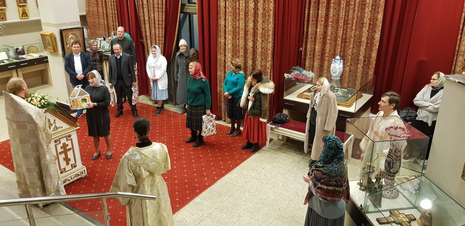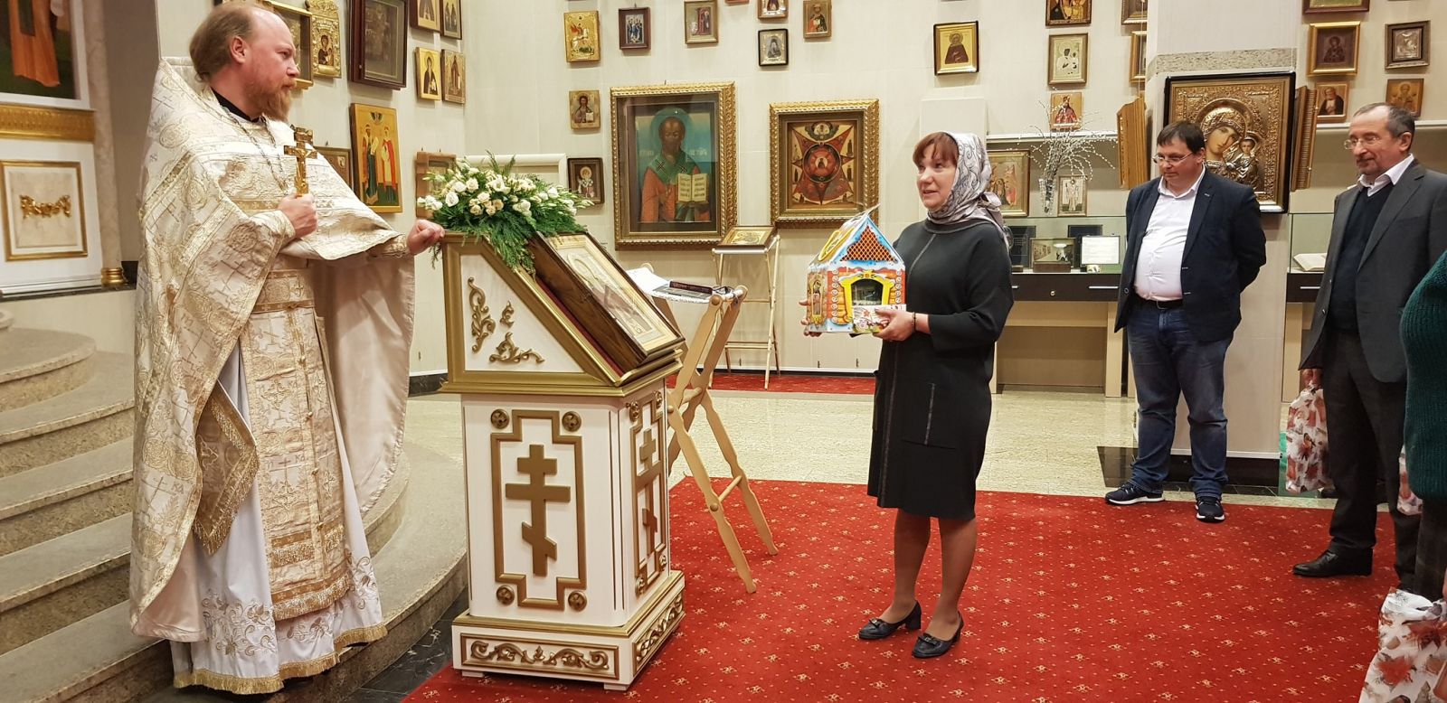 В дар домовому храму Святейший Патриарх Кирилл передал список Казанской иконы Божией Матери. Создатель Музея русской иконы и меценат М.Ю. Абрамов передал в дар домовому храму икону XVIII века «Всевидящее око». Во внимание к помощи Русской Православной Церкви и в связи с 15-летием образования Счетной палаты Предстоятель вручил Патриаршие грамоты С.В. Степашину, руководителю аппарата Счетной палаты С.М. Шахраю, директору Департамента Счетной палаты А.Г. Михайлику и аудитору Счетной палаты С.Н. Рябухину. С приветственным словом к Его Святейшеству обратился C.В. Степашин, председатель Счетной палаты и председатель Императорского православного палестинского общества. С.В. Степашин вручил почетные грамоты ИППО ряду благотворителей, оказывающих содействие обустройству храма прп. Сергия.