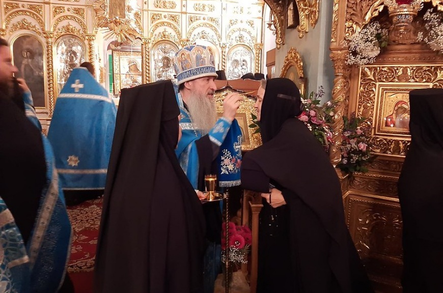 По окончании Литургии был совершен молебен перед чудотворной Казанской иконой Божией Матери и Крестный ход вокруг Казанского храма. По возглашении уставных многолетий архимандрит Александр обратился с приветственным словом к молящимся в храме, в котором поздравил игумению Екатерину и сестер с престольным торжеством обители.