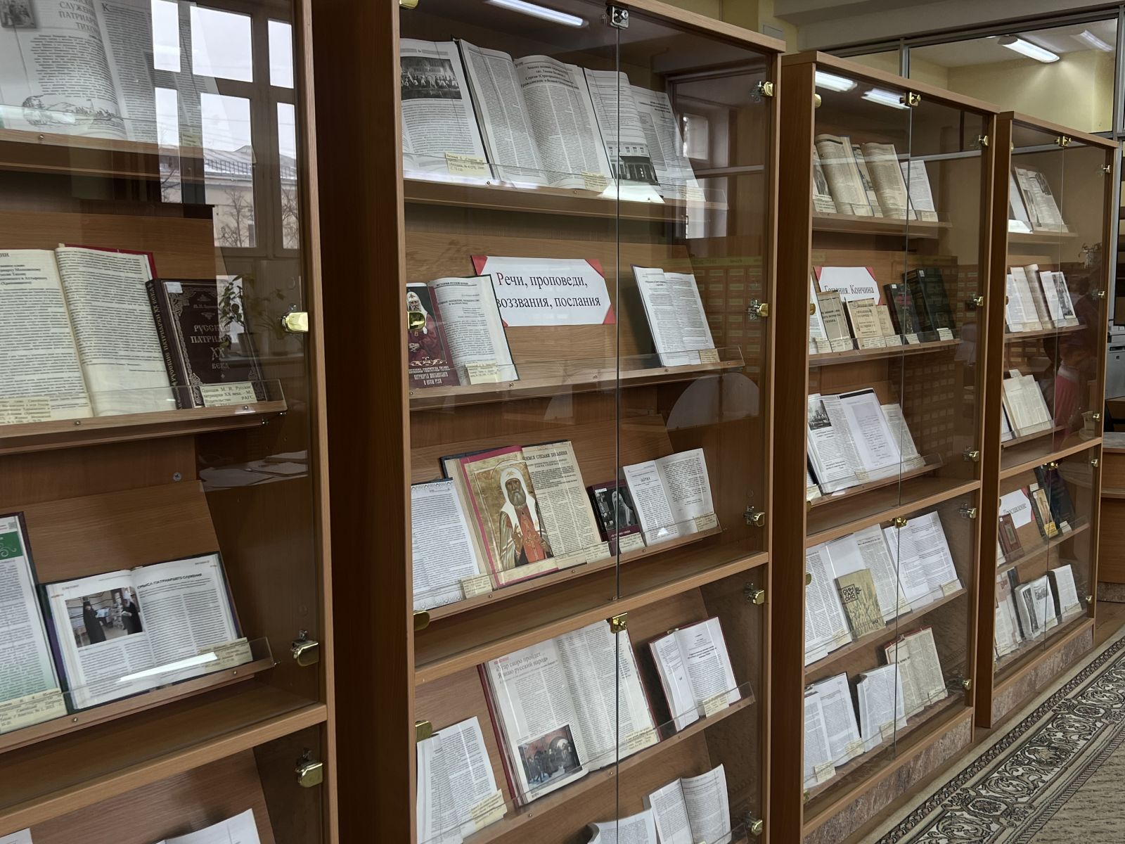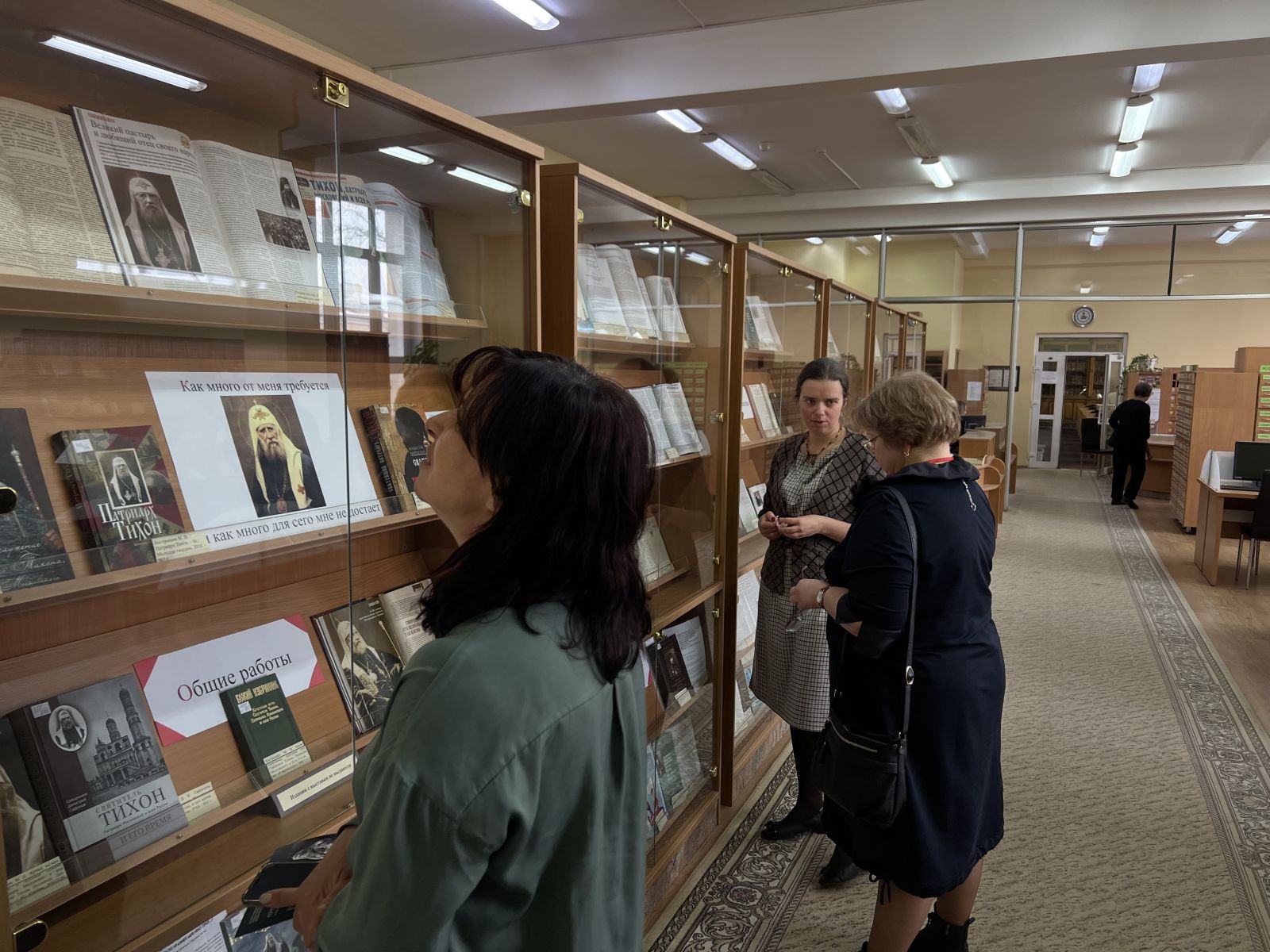 Перед началом работы конференции участники и гости мероприятия ознакомились с книжной выставкой «Как много от меня требуется и как много для сего мне не достает», приуроченной к 100-летию кончины свт. Тихона, Патриарха Московского.