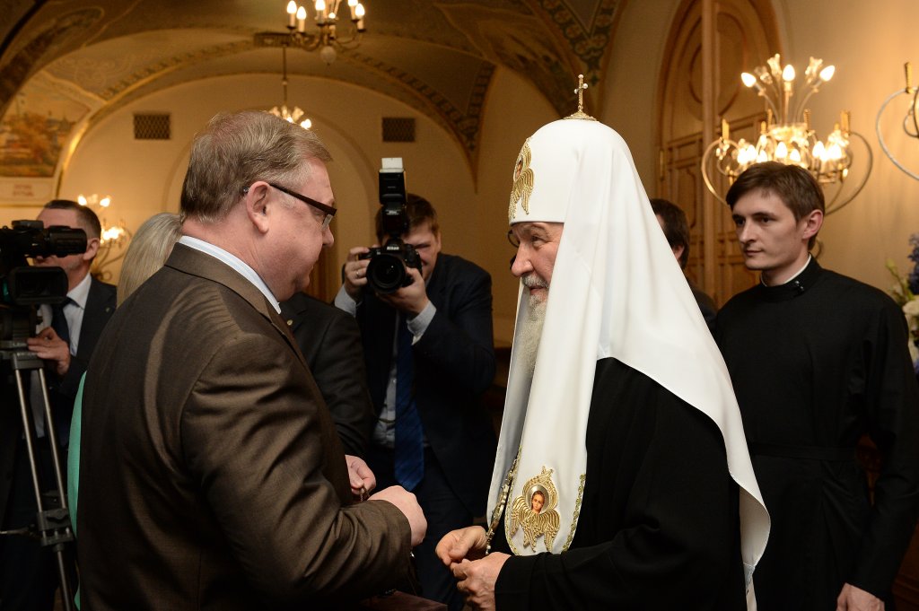 25 мая 2015 года в Трапезных палатах кафедрального соборного Храма Христа Спасителя в Москве состоялся прием по случаю Дня славянской письменности и культуры и тезоименитства Святейшего Патриарха Московского и всея Руси Кирилла. Перед началом приема Предстоятель Русской Православной Церкви принял личные поздравления гостей.