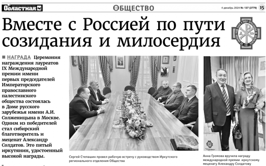 Напомним, торжественное вручение Международных премий имени первых председателей Императорского Православного Палестинского Общества Великого Князя Сергея Александровича в номинации «Патриотическое воспитание молодого поколения» и имени Великой Княгини Елизаветы Федоровны в номинации «Бескорыстное служение делу милосердия, благотворительности и гуманитарного образования молодого поколения» прошло 22 ноября в Москве в Доме русского зарубежья имени А. И. Солженицына.