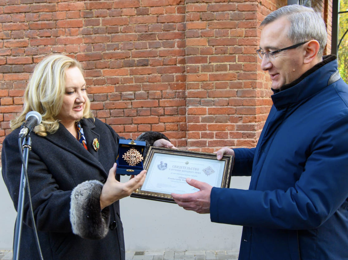 Она поблагодарила калужан за просветительские труды и вручила юбилейные знаки к 10-летию Фонда ЕСПО.