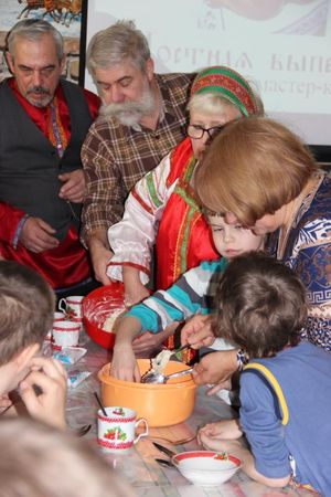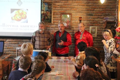 Когда слепленные „жаворонки“ отправились в печь, член Калужского отделения ИППО, инициатор создания трапезной „Русские традиции“ Сергей Георгиевич Котельников познакомил гостей с книгами, рассказывающими о традициях русской кухни, секретах монастырской кухни и рецептах постных блюд, дошедших от наших предков из глубины веков.