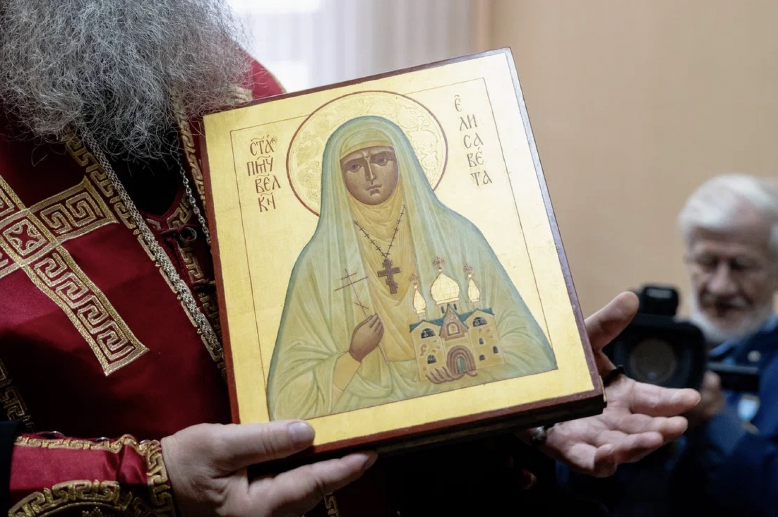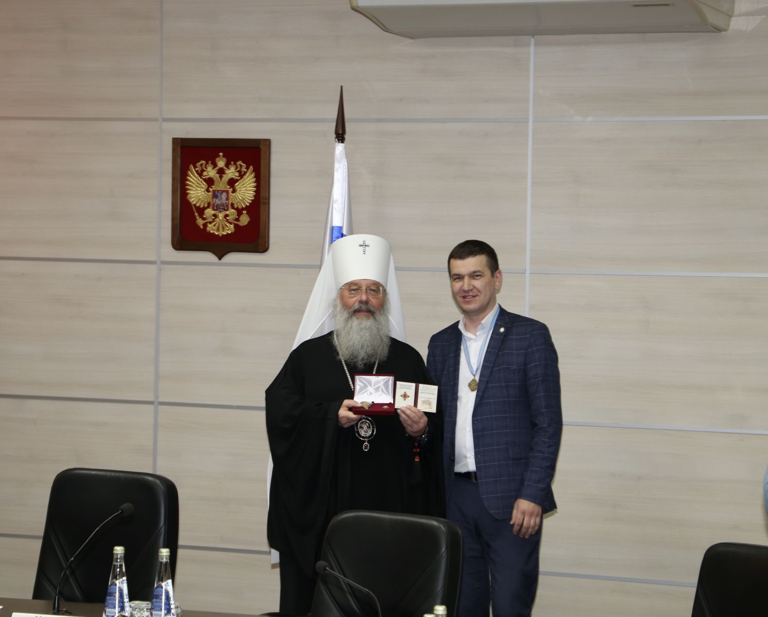 Далее руководитель Татарстанского отделения ИППО Кузьма Морозов в честь 160-летия со дня рождения Великой Княгини Елисаветы вручил митрополиту Кириллу почётный памятный знак — орден преподобномученицы Елисаветы Феодоровны и флаг Императорского Православного Палестинского Общества.