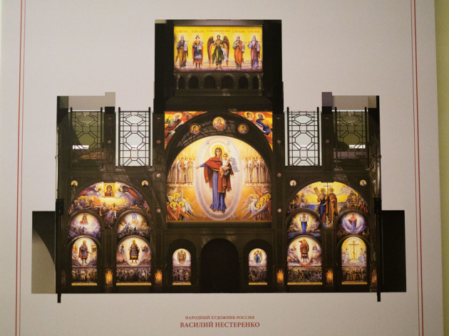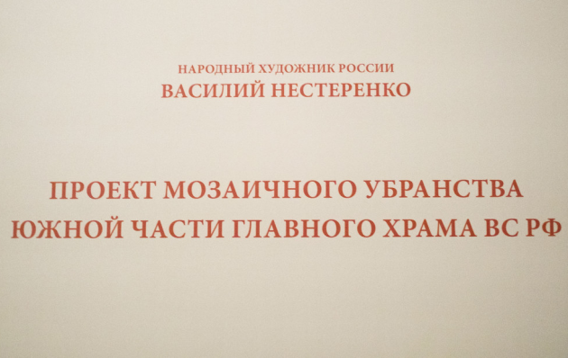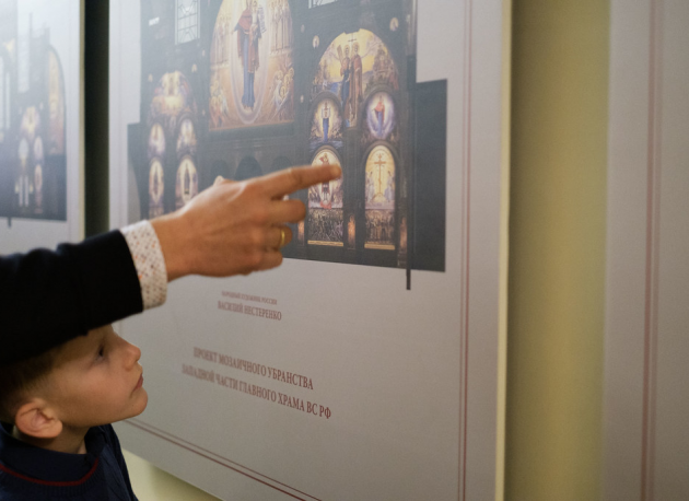 Всего представлено 13 масштабных работ художника. Самая интересная часть экспозиции — эскиз Образа Спаса Нерукотворного в центральном куполе. Это самое большое изображение лика Христа, выполненное в мозаике. На выставке представлены совершенно разные варианты художественного решения, которые дают возможность посмотреть на Главный храм Вооруженных Сил глазами автора концепции Василия Нестеренко и его коллег.