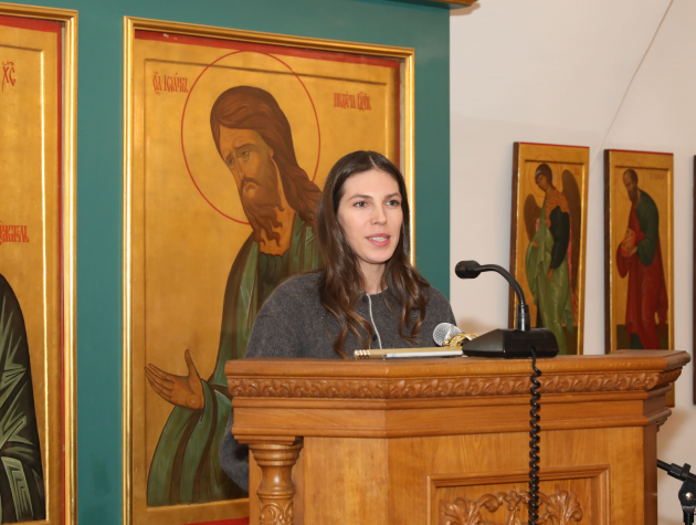 Затем прозвучал доклад заместителя Председателя ИППО, председателя Наблюдательного Совета Фонда содействия возрождению традиций милосердия и благотворительности «Елисаветинско-Сергиевское просветительское общество» Анны Громовой.