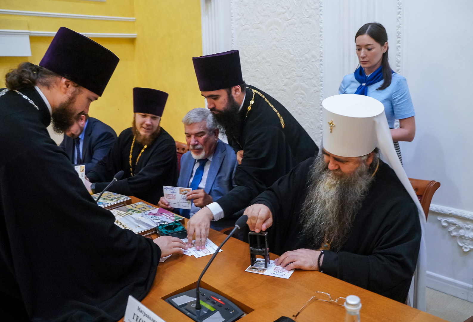 Митрополит Георгий, Андрей Гнеушев, архимандрит Александр и Олег Колобов поставили свои подписи на конвертах.
