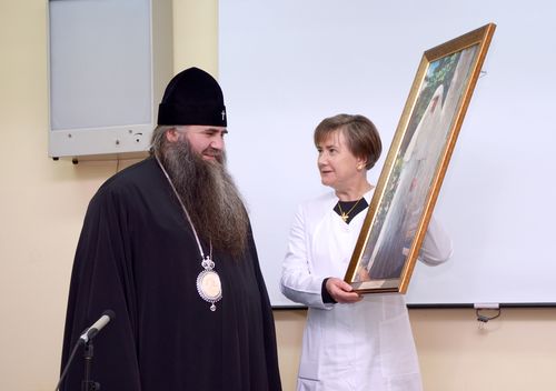 Его Высокопреосвященству на память о встрече преподнесли от всего персонала больницы картину с изображением св. преподобномученицы Великой княгини Елисаветы Феодоровны и памятный адрес.