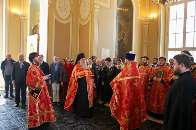 Затем митрополит Воскресенский Дионисий совершил молебен о здравии Действительных членов ИППО в домовом храме Общества — надвратном храме Новоспасского монастыря во имя преподобного Сергия Радонежского.