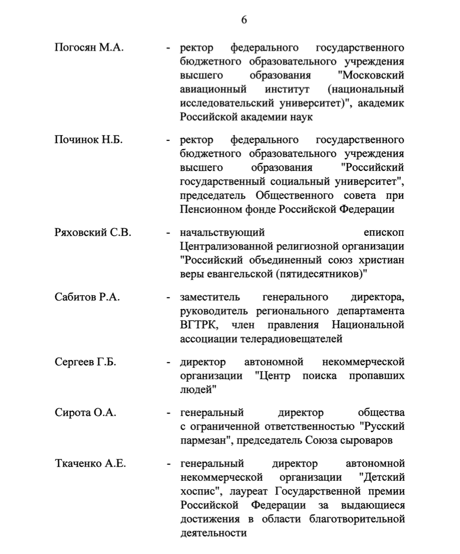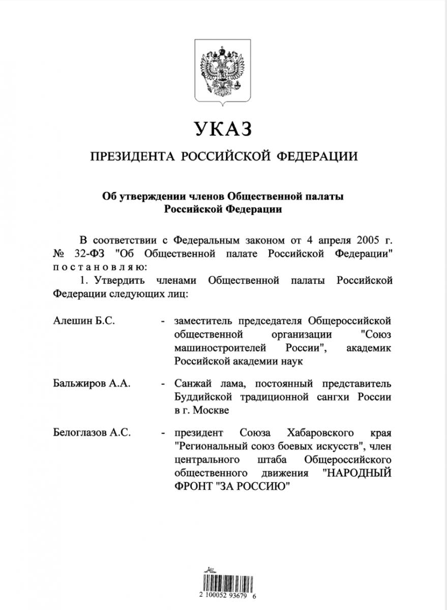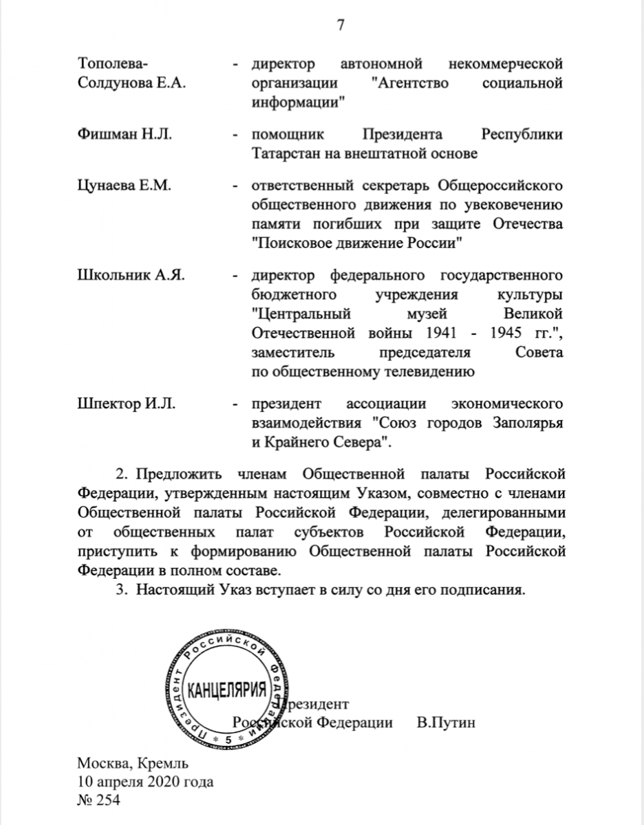 Членам Общественной палаты РФ, утвержденным настоящим указом, совместно с членами Общественной палаты РФ, делегированными от общественных палат субъектов России, предложено приступить к формированию Общественной палаты РФ в полном составе.