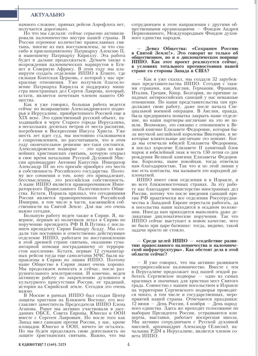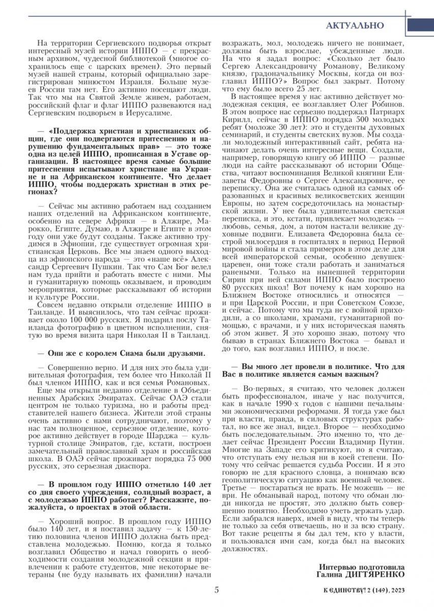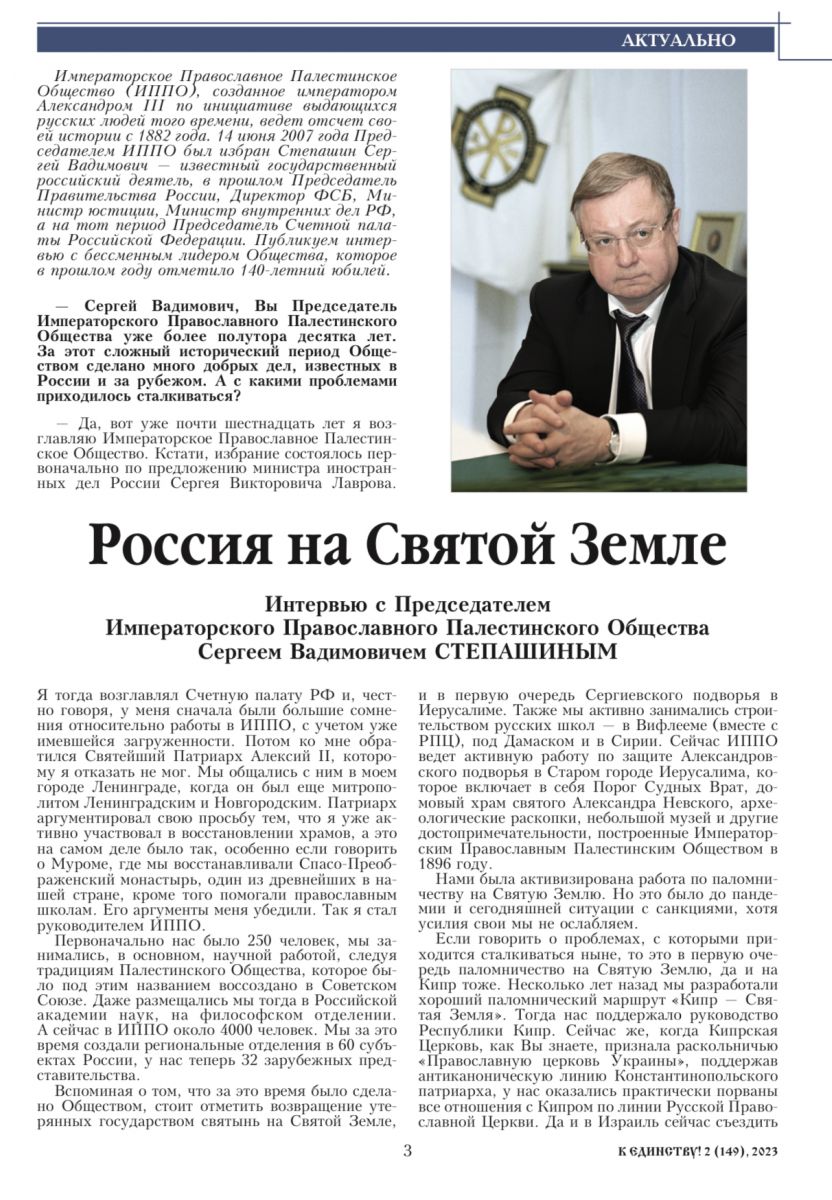 Второй в 2023 году выпуск журнала открывает интервью с Председателем Императорского Православного Палестинского Общества Сергеем Вадимовичем Степашиным, который возглавляет старейшую в России международную общественную организацию около 16 лет.