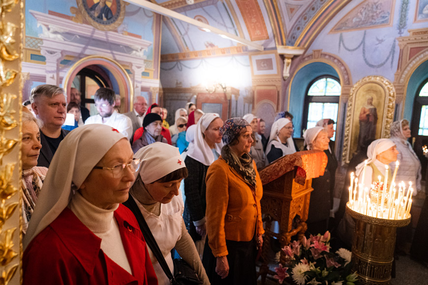 Всё храмовое пространство пестрит ало-золотым пасхальным облачением духовенства, нарядными платками и белыми апостольниками. Здесь много сестёр милосердия. Как объясняет настоятель храма митрополит Рязанский и Михайловский Марк, они стремятся сюда, потому что это храм Святой Великой княгини Елисаветы Феодоровны, явившей нам великий пример милосердия. Этому примеру стараются следовать все, кто так или иначе посвящает себя служению людям. Сёстры считают Елисавету Феодоровну своей покровительницей.