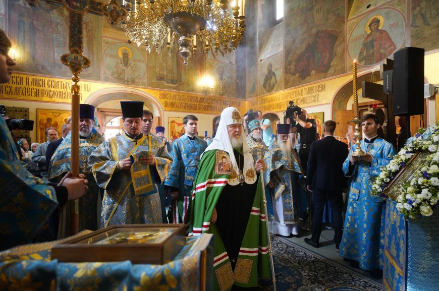 По окончании Литургии Святейший Патриарх совершил славление и молитву Пресвятой Богородице перед списком Казанской иконы Божией Матери.