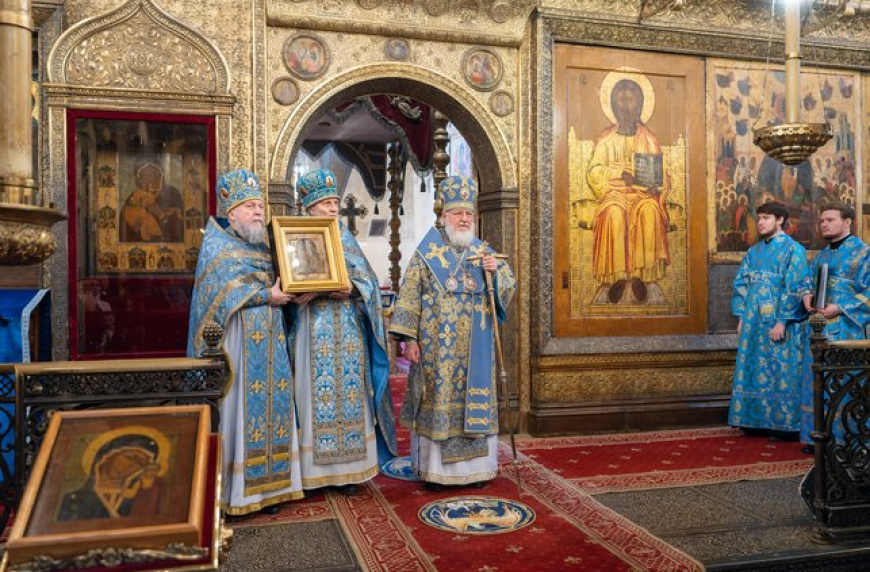 После входных молитв и облачения Его Святейшества чудотворную Казанскую икону вынесли из алтаря на солею. Поднявшись на солею, Предстоятель Русской Православной Церкви рассказал об обретении чудотворного Казанского образа Божией Матери, перед которым молились князь Дмитрий Пожарский и Кузьма Минин. Икона была украдена в 1918 году из Казанского собора на Красной площади г. Москвы. Место ее нахождения до последнего времени оставалось неизвестным.
