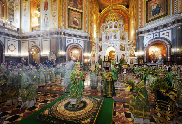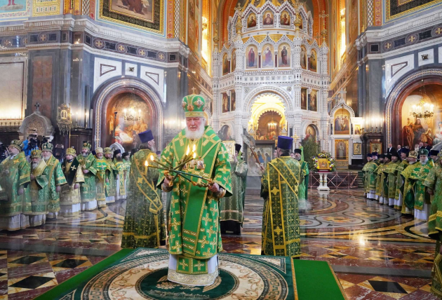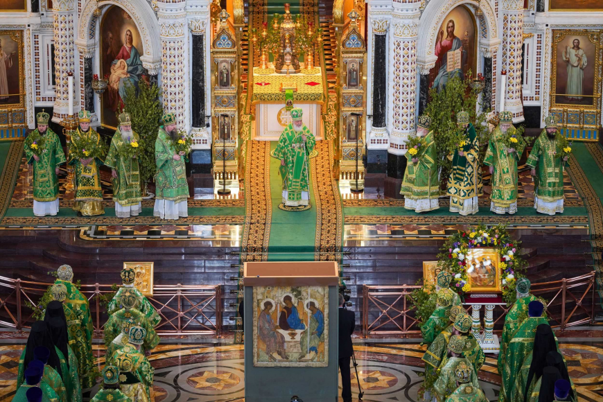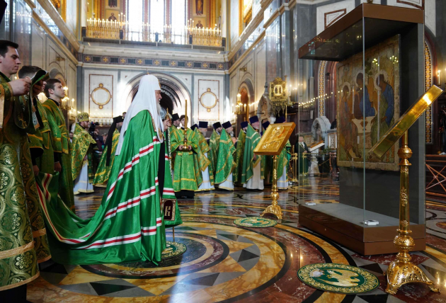 По прибытии в храм Предстоятель Русской Православной Церкви поклонился иконе Святой Троицы, написанной преподобным Андреем Рублевым, которая в день праздника была принесена в Храм Христа Спасителя и установлена в центре храма для поклонения верующих.