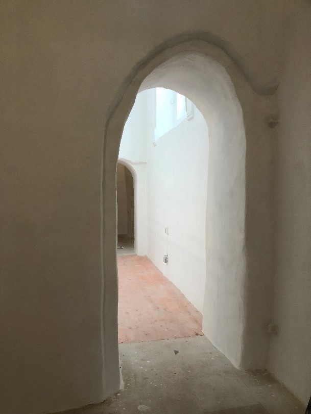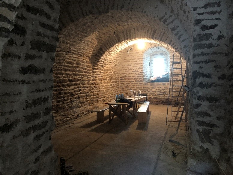 Когда мы приступили к реставрации, все помещения были не только захламлены, но и завалены мусором, обломками, грунтом. От древней лестницы, которая вела в подвальную часть здания, уцелели всего несколько нижних ступенек, по которым удалось рассчитать и восстановить её полный профиль. Некоторые замечательные шахтные или бойничные оконные проёмы пришлось реставрировать по сохранившимся фрагментам кладки.