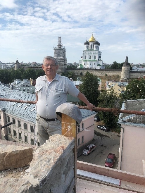 Заместитель руководителя Псковского отделения ИППО И.И. Лагунин на звоннице храма Косьмы и Дамиана с Примостья в Пскове в процессе реставрации.