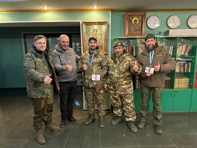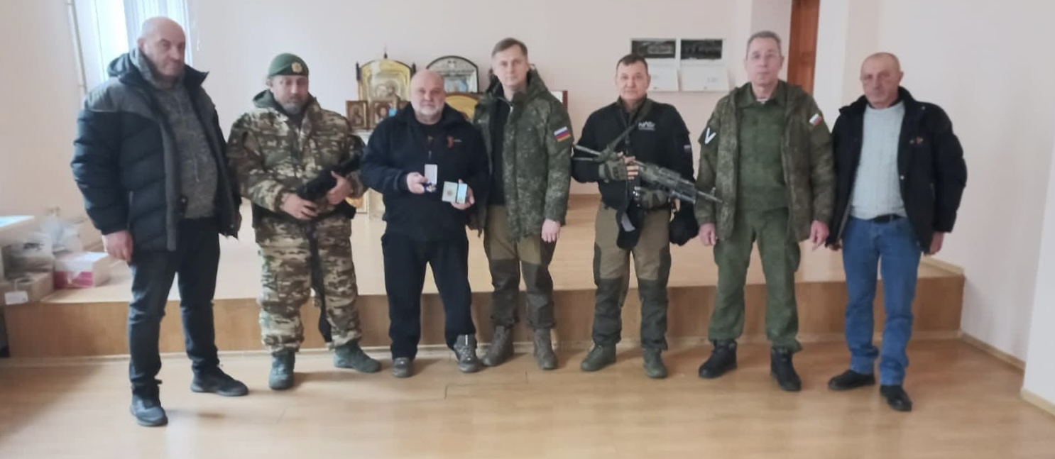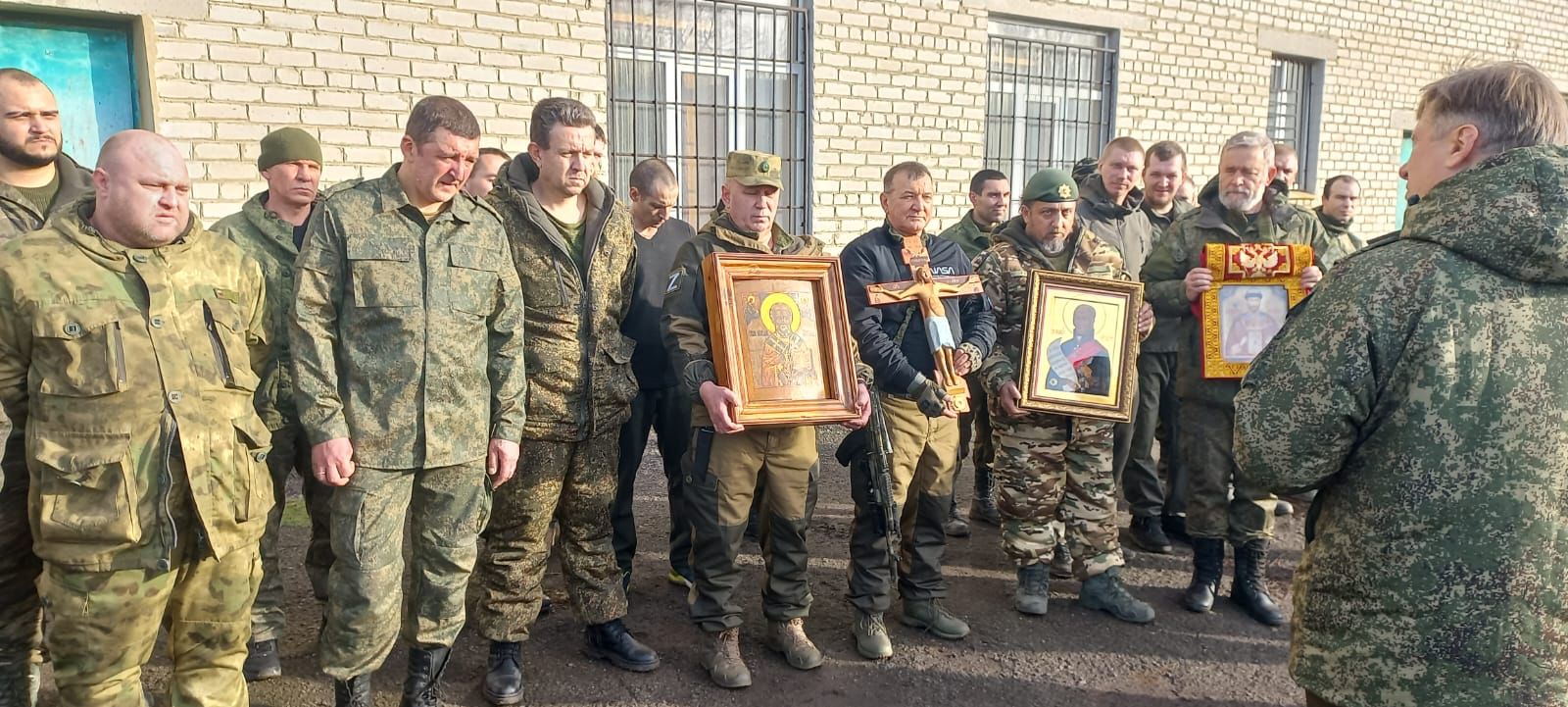 С делегацией прибыли также священник Московской Епархии Отец Макарий (Мантров) и матушка Лариса, которые привезли с собой чудотворные иконы Николая Чудотворца и Адмирала Ушакова. Каждый русский воин нуждается в помощи высших сил, в окормлении священника, в нательном крестике как защите и духовном орудии в бою. Члены делегации вместе с бойцами приняли участие в коллективном молебне. По окончании молебна были розданы иконы и нательные кресты.