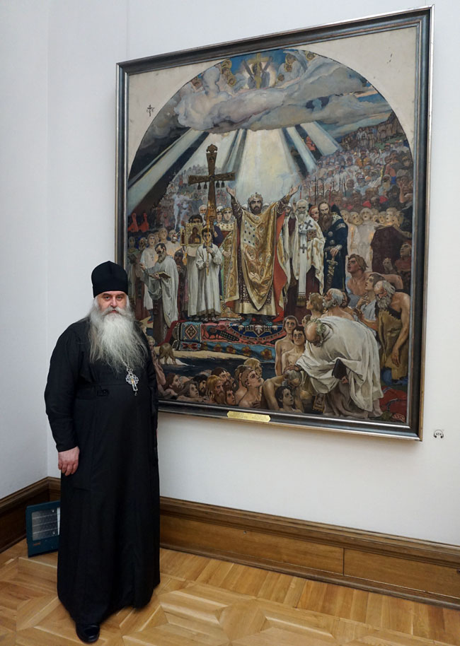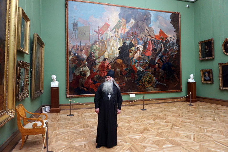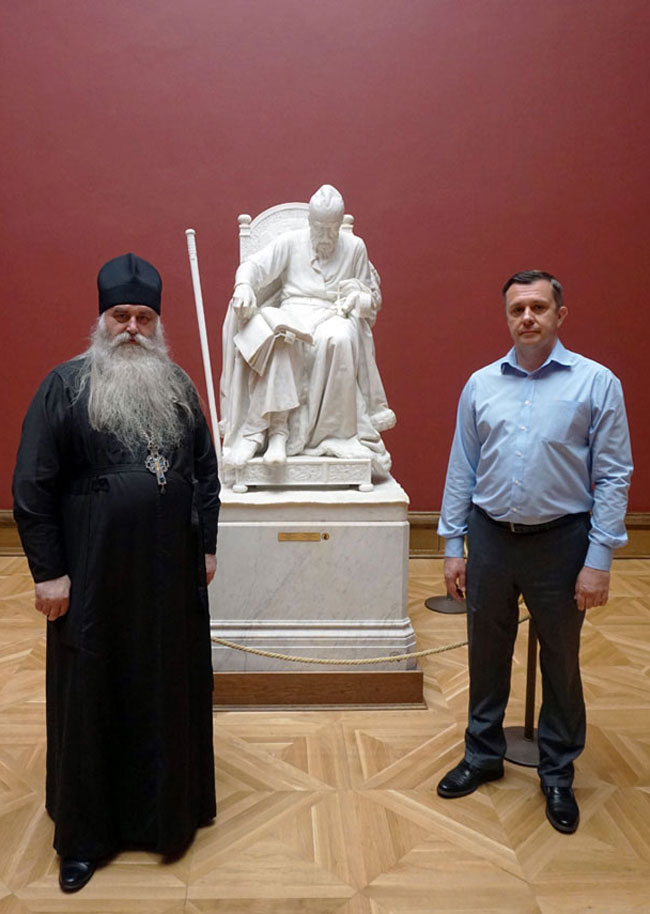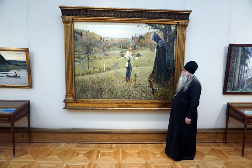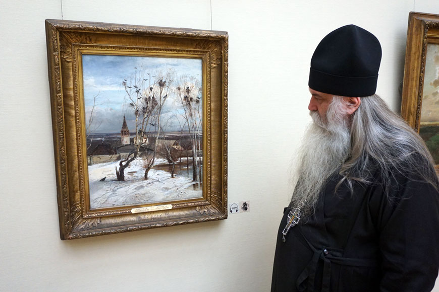 Архимандрит Тихон и Александр Панин на протяжении нескольких часов знакомились с выдающимися произведениями живописи. Ознакомление сочеталось с размеренной беседой и фотографированием произведений искусства.