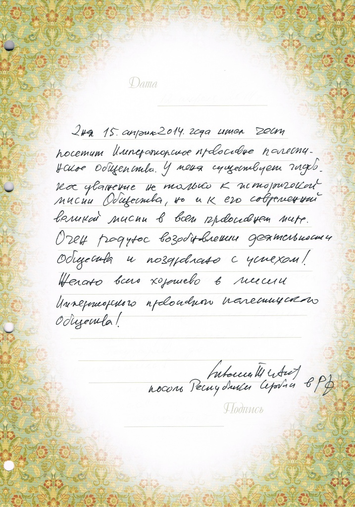 Особое впечатление на Посла Сербии произвела информация о возвращении ИППО на Святую Землю, выразившееся в восстановлении прав на собственность, в частности на Сергиевское подворье, строительстве Центра культуры и науки в Вифлееме и создании музейно-паркового комплекса в Иерихоне. Как представитель православной Сербии д-р Славенко Терзич горячо приветствовал деятельность ИППО, направленную на защиту христиан на Ближнем Востоке и в Северной Африке и осуществляемую специально созданным для этих целей Общественным центром ИППО.