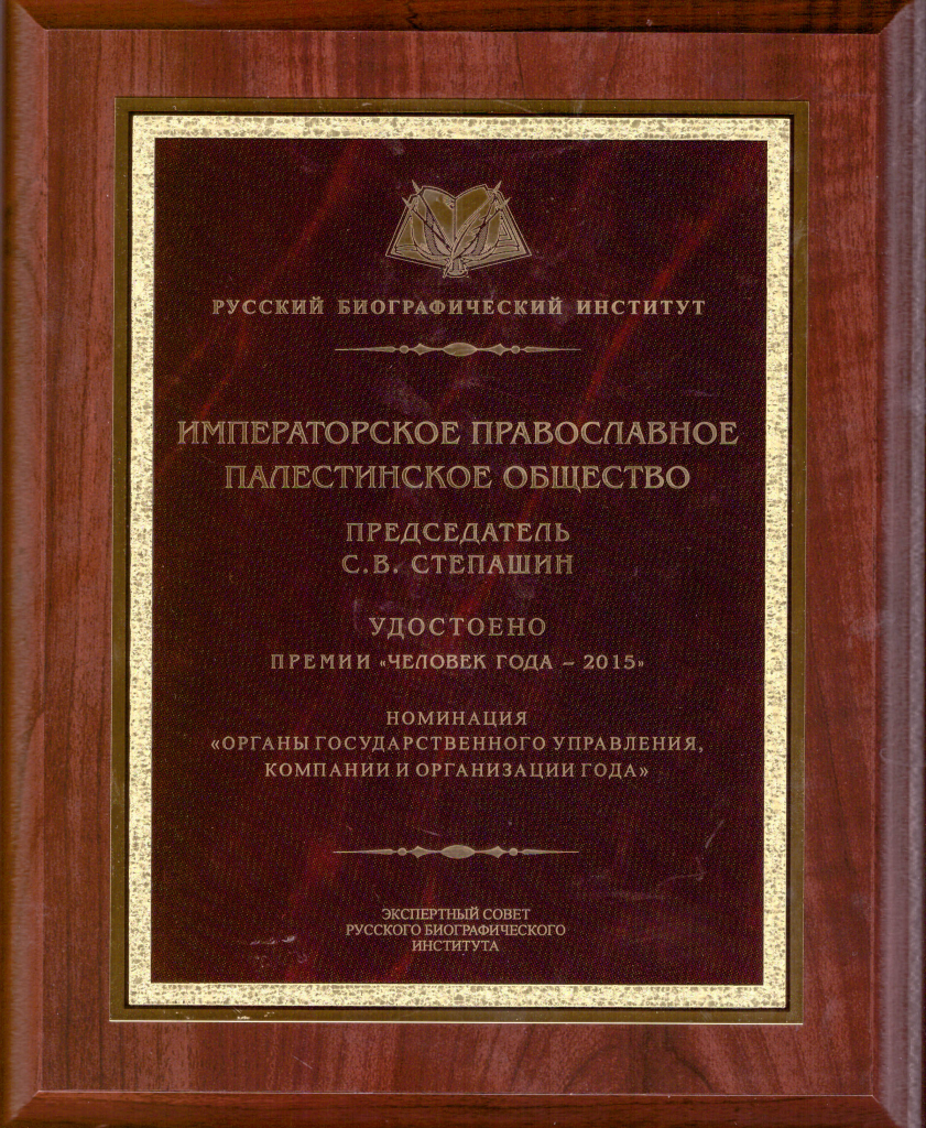 Ведущая церемонию известный диктор телевидения Анна Шатилова представляя Императорское Православное Палестинское Обществ, одного из лауреатов премии "Человек года-2015", отметила, что исторически Общество занималось паломничеством, научным палестиноведением, укреплением гуманитарного сотрудничества с народами Ближнего Востока и успешно продолжает благородную миссию. Ведущая также отметила, что Общество удостоено Благодарности Президента России (2012 год) - за большой вклад в сохранение и популяризацию культурного и исторического наследия России на Святой Земле, укрепление дружбы и сотрудничества с народами.