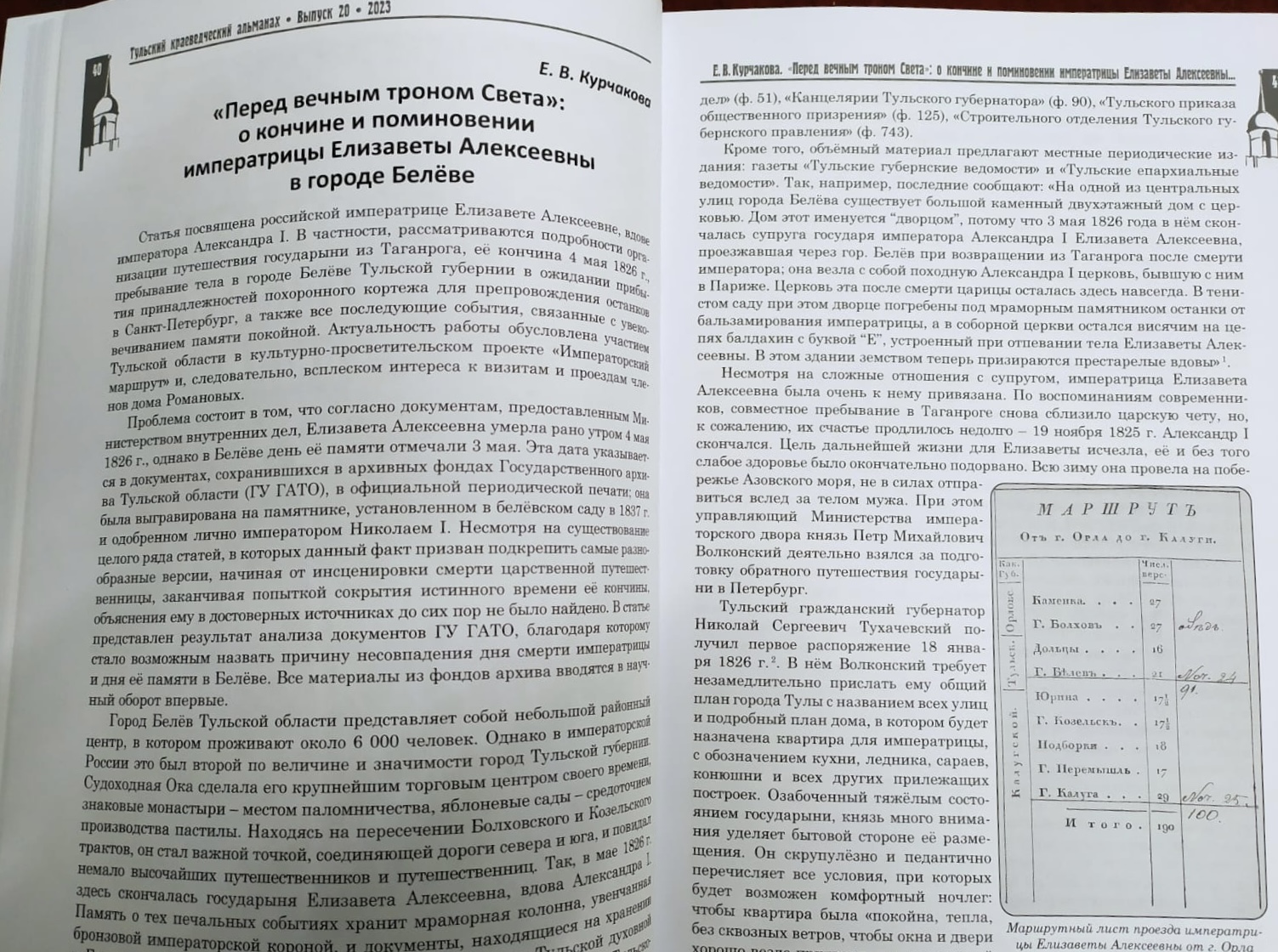 Статья «"Перед вечным троном Света": о кончине и поминовении Императрицы Елизаветы Алексеевны в городе Белёве» посвящена последним дням пребывания Императрицы в Белёве (Тульская область) в 1826 году, обстоятельствам её кончины в этом городе и белёвским традициям поминовения Елизаветы Алексеевны.