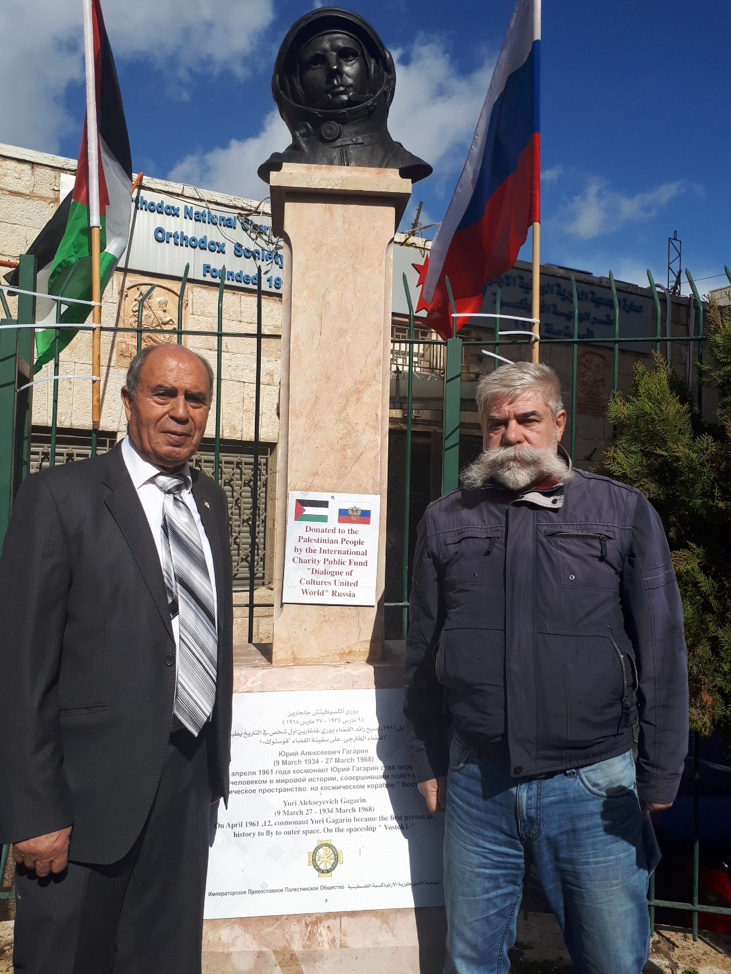На фото: у памятника Ю. А. Гагарину председатель Вифлеемского отделения ИППО Дауд Матар и председатель Калужского отделения ИППО Виталий Гороховатский.