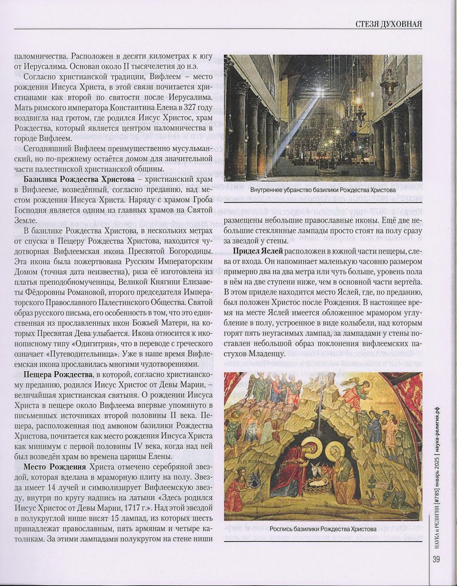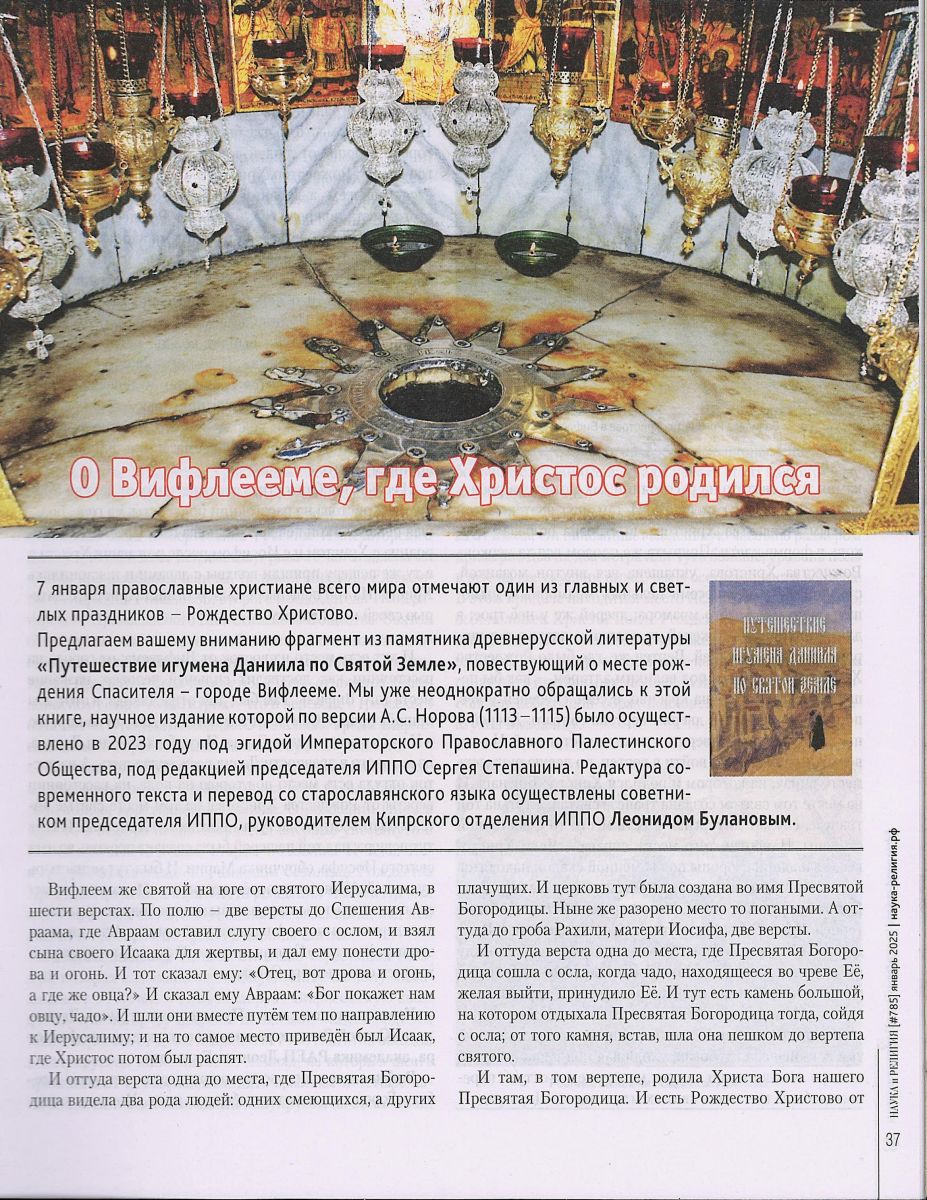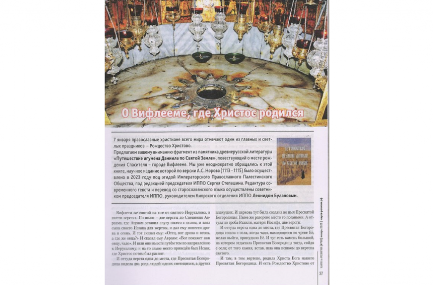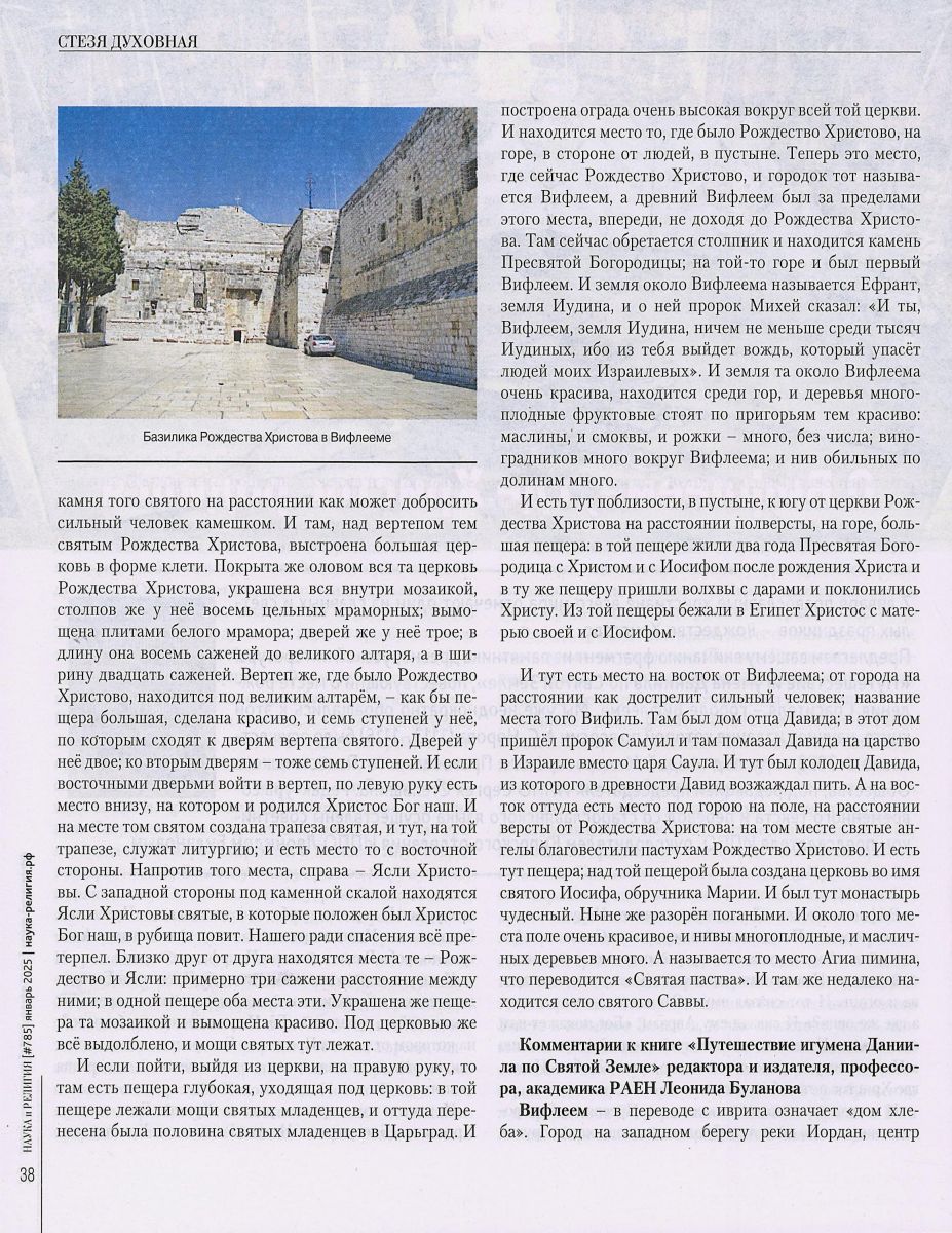 В январском номере журнала «Наука и Религия» в разделе «Стезя духовная», опубликован фрагмент из памятника древнерусской литературы «Путешествие игумена Даниила по Святой Земле», повествующий о месте рождения Спасителя — городе Вифлееме.