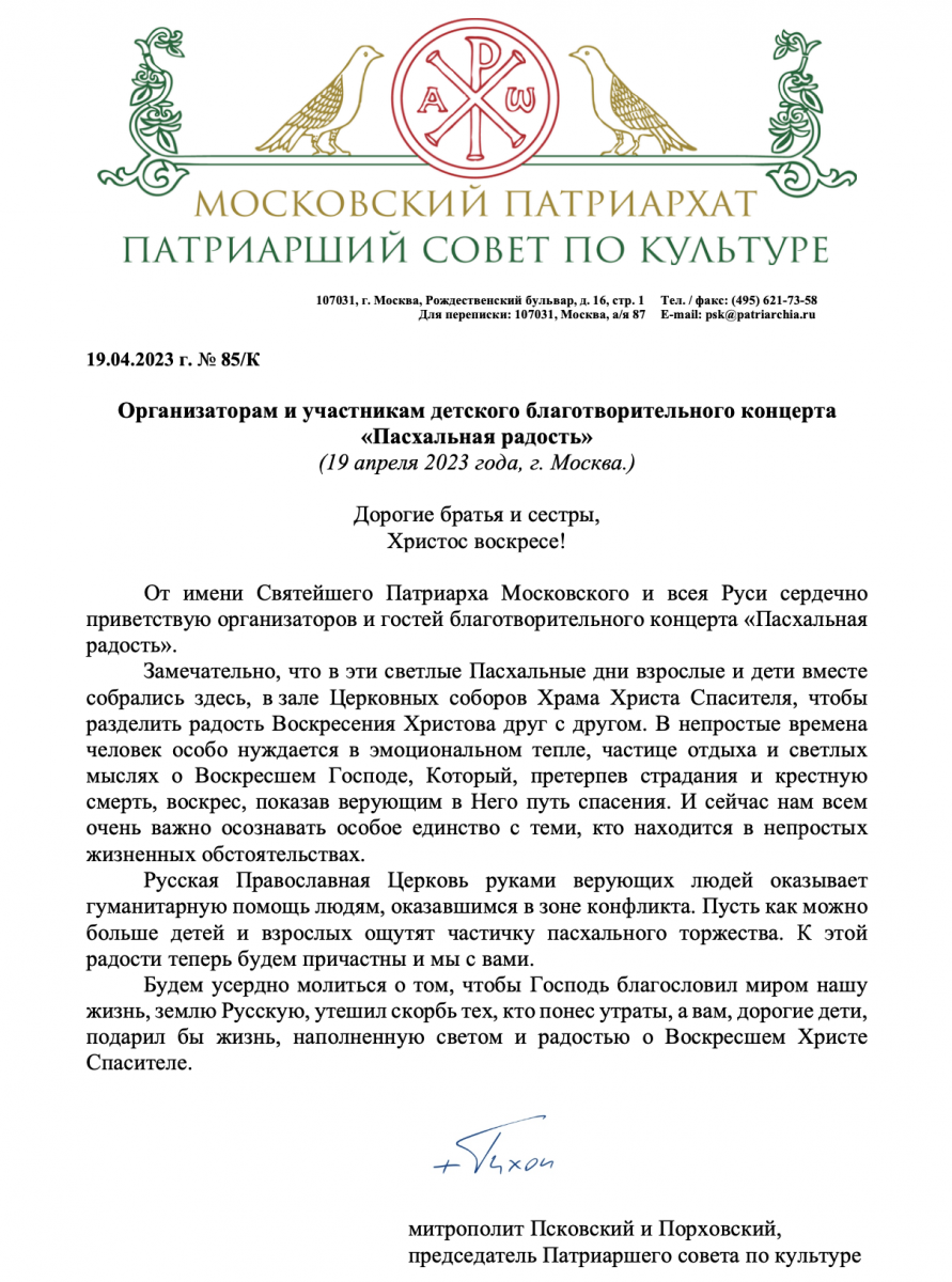 Член Совета, руководитель Культурно-просветительской секции ИППО Павел Карпухин зачитал приветственный адрес участникам, организаторам и гостям концерта, направленный от имени Святейшего Патриарха Московского и всея Руси Кирилла председателем Патриаршего совета по культуре, митрополитом Псковским и Порховским Тихоном (Шевкуновым).