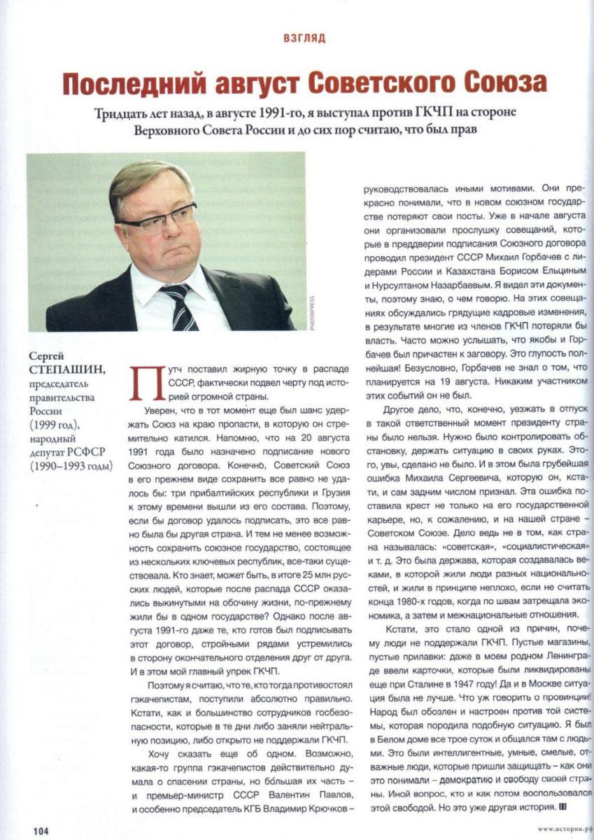 В журнале «Историк» опубликована статья экс-премьера России Сергея Степашин «Последний август Советского Союза»