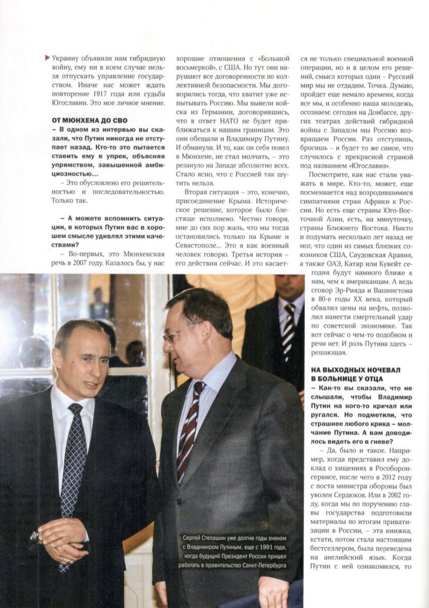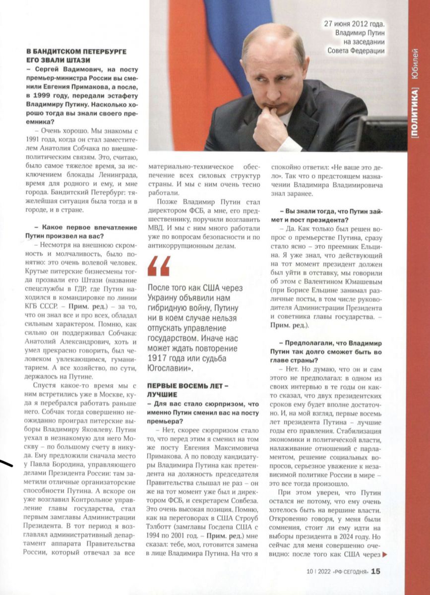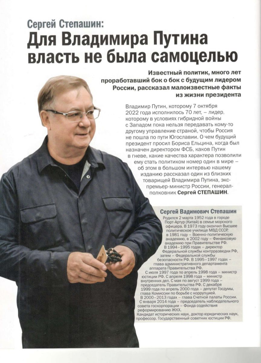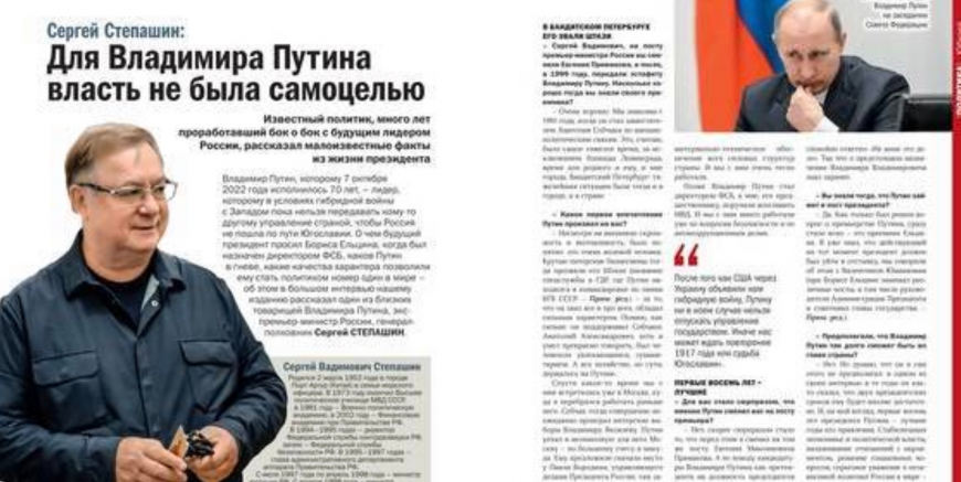 В журнале «Российская Федерация сегодня» опубликовано интервью Сергея Степашина "Для Владимира Путина власть не была самоцелью"