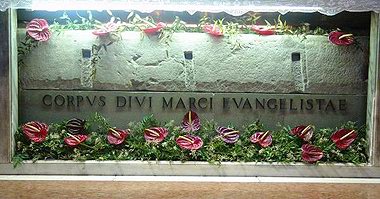 Мощи святого были торжественно сопровождены в Венецию и положены в домашней церкви дожей, которая получила свое имя в честь святого Евангелиста, ставшего с тех пор покровителем Венеции. Древняя мозаика фасада притвора нынешнего собора святого Марка (XIII век) изображает процессию положения мощей в церкви.