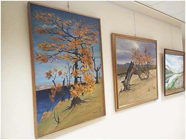 Тёплые краски утренней зари переданы мастером посредством листьев початка кукурузы, а яркие краски спелой осени лепестками роз, тюльпанов и «золотых шаров». Купола православных храмов сверкают на её полотнах соломкой, даже не покрытой лаком, – это природное сияние. Профессиональные художники представили пейзажи тех биосферных заповедников, которые запечатлены с натуры, особенно повезло Байкалу и Соловкам.