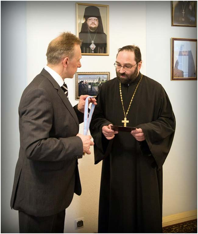В свою очередь иеромонах Давид передал Леониду Буланову книгу, посвящённую 25-летию возрождения Коневского Рождество-Богородичного мужского монастыря.